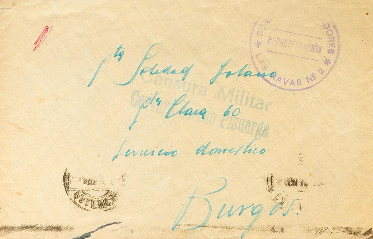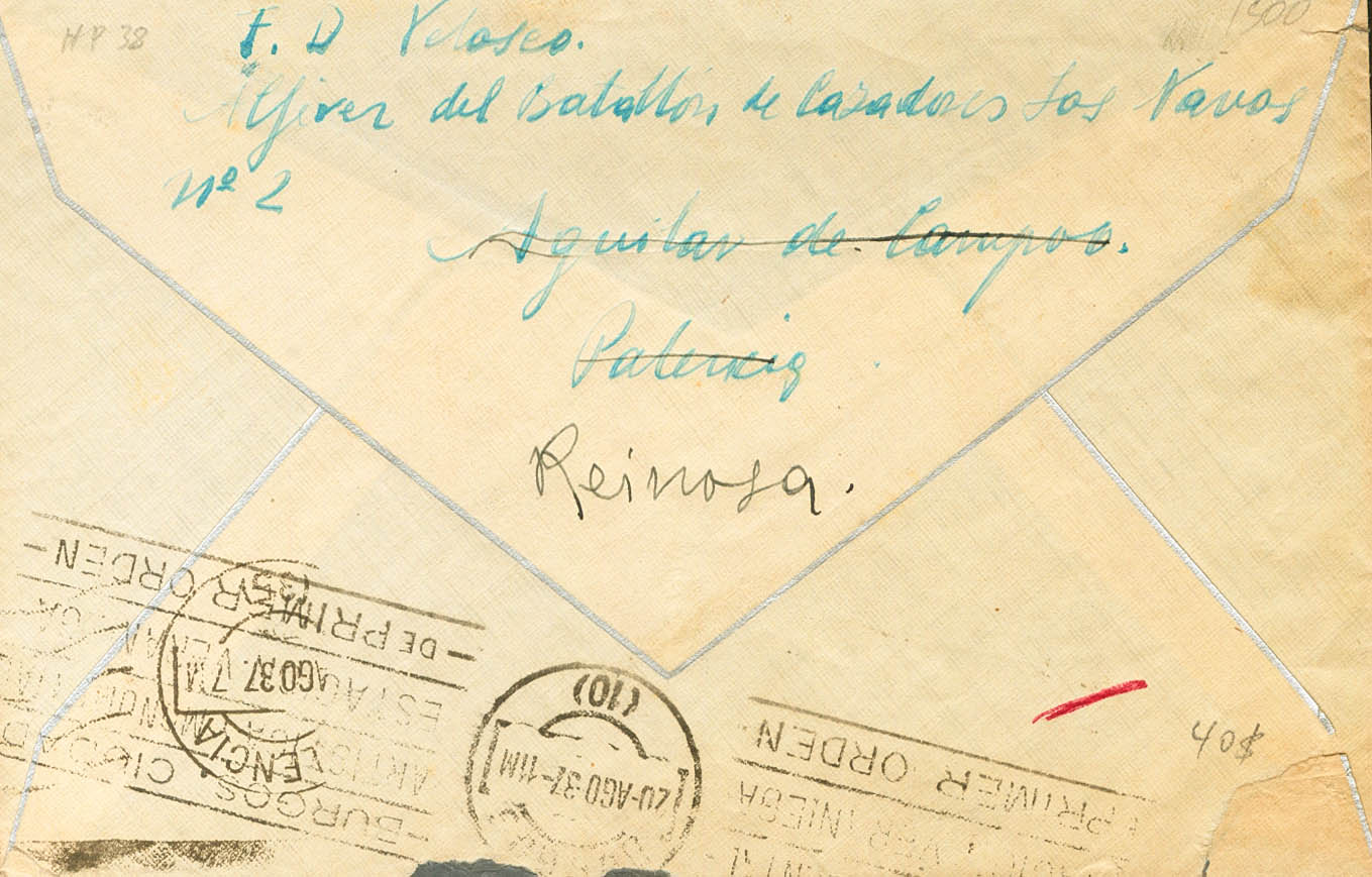 1937. REINOSA a BURGOS. Marca de franquicia 3º BON DE CAZADORES / REPRESENTACION / LAS NAVAS Nº2, en violeta y CENSURA MILITAR / CERVERA DE RIO PISUERGA, en azul y al dorso llegada. MAGNIFICA Y RARA.