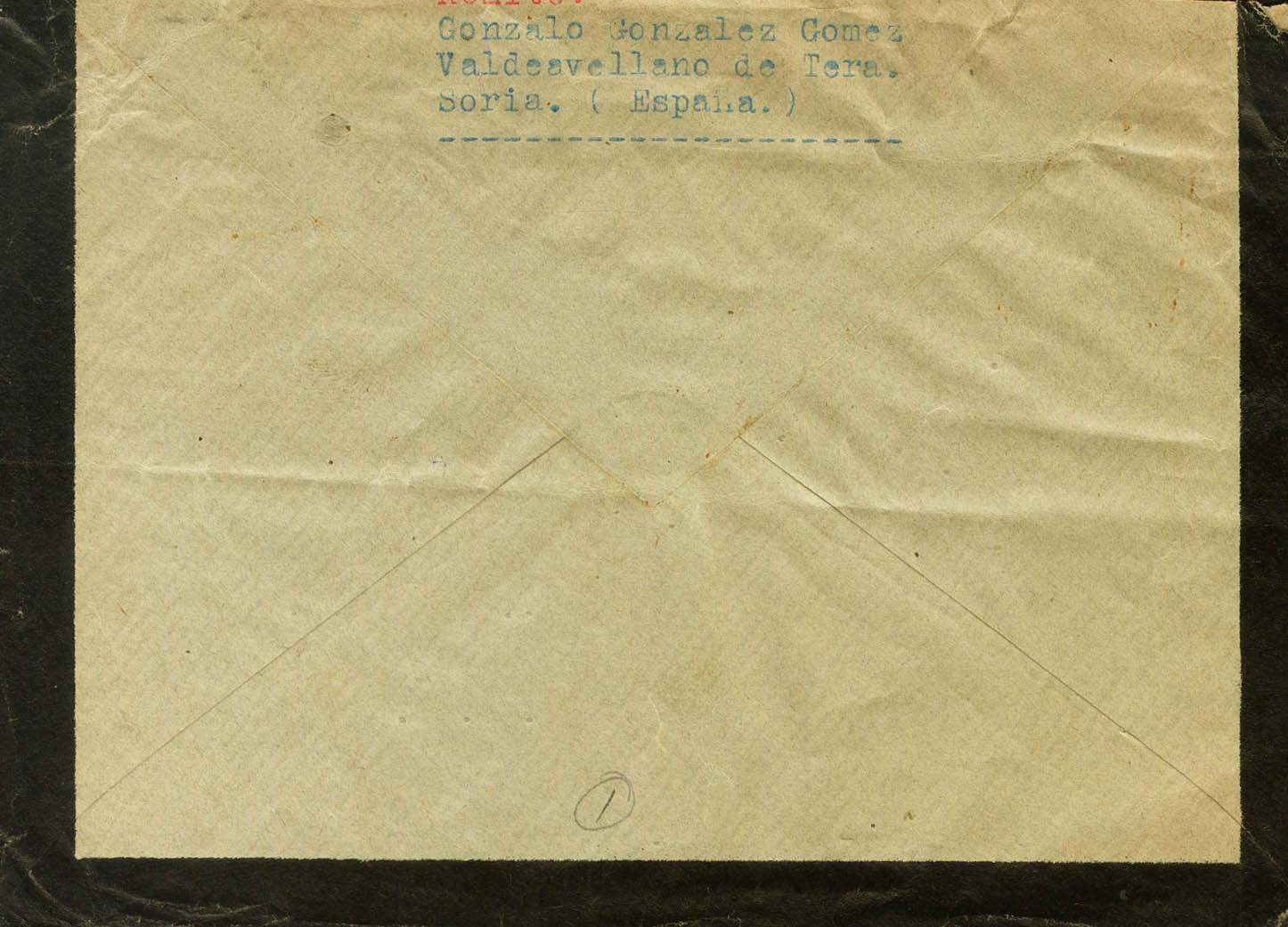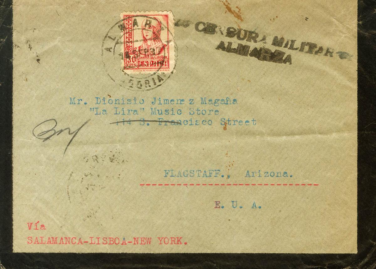 1937. 30 cts rosa. VALDEAVELLANO DE TERA (SORIA) a FLAGSTAFF (U.S.A.). En el frente marca CENSURA MILITAR / ALMARZA, en negro. MAGNIFICA Y MUY RARA.