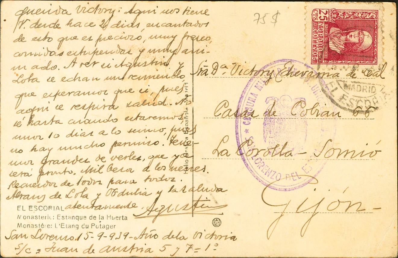 856. 1939. 25 cts carmín. Tarjeta Postal de SAN LORENZO DEL ESCORIAL (MADRID) a LA COROLLA (ASTURIAS). En el frente marca CENSURA MILITAR DE COMUNICACIONES / SAN LORENZO DEL ESCORIAL, en violeta. MAGNIFICA.