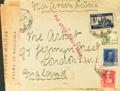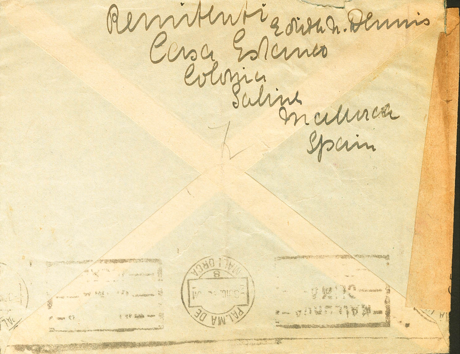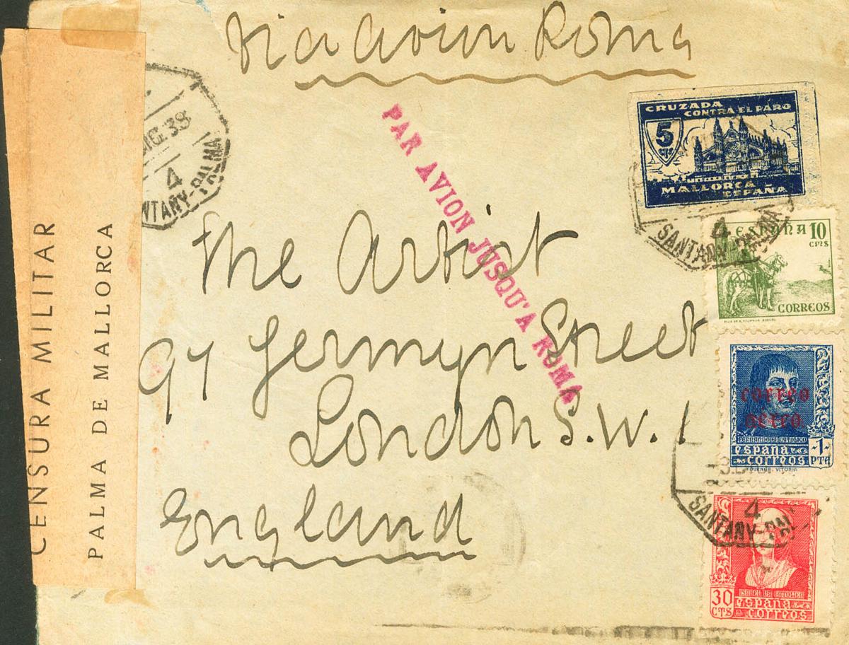 857, 817, 846. 1938. 30 cts rosa, 10 cts verde, 1 pts azul y Local de 5 cts azul. PALMA DE MALLORCA a LONDRES (GRAN BRETAÑA). Matasello ambulante AMB / 4 / SANTAÑY-PALMA y en el frente marca PAR AVION JUSQ´A ROMA, en violeta. MAGNIFICA.