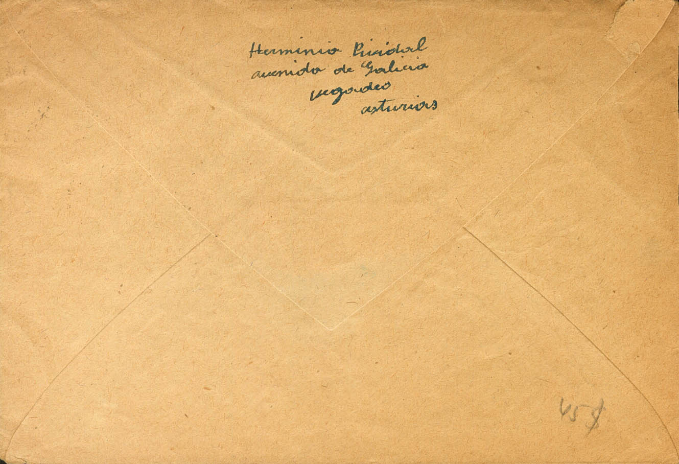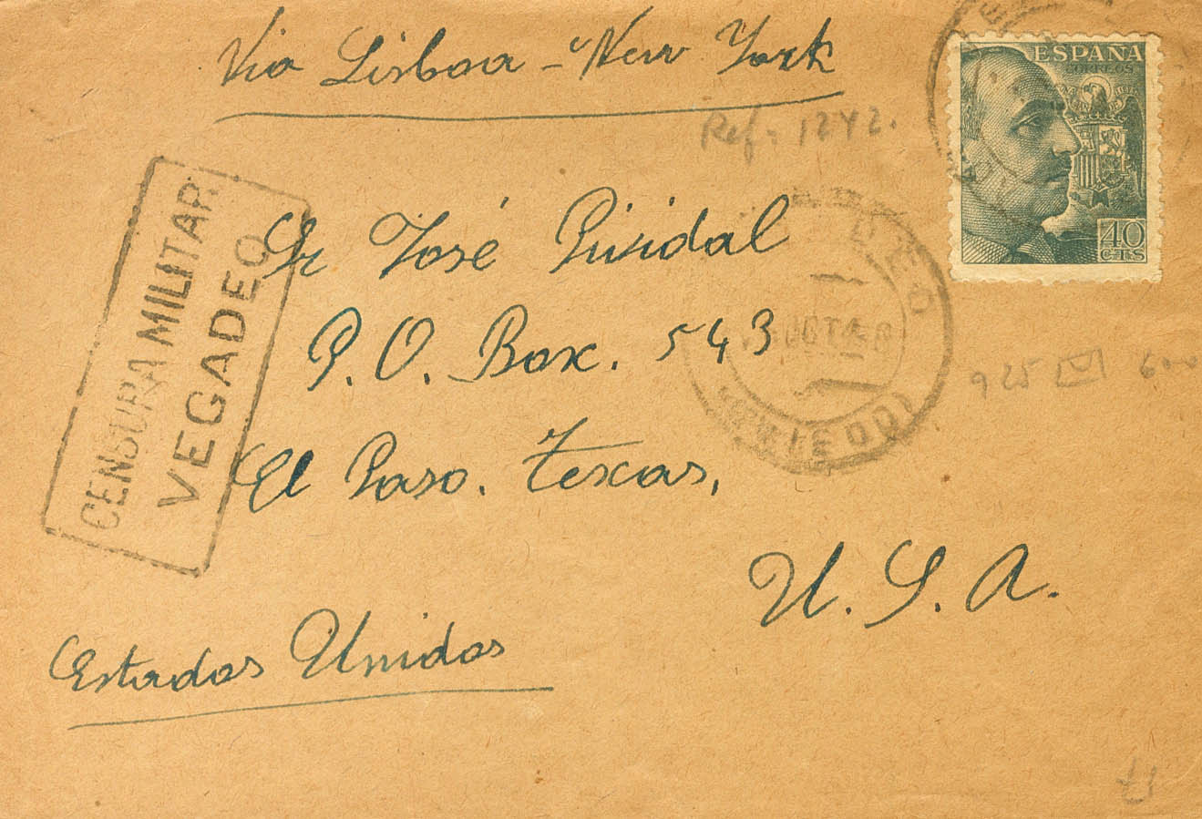 925. 1940. 40 cts verde gris. VEGADEO (ASTURIAS) a EL PASO (U.S.A.). En el frente marca CENSURA MILITAR / VEGADEO, en negro. MAGNIFICA.