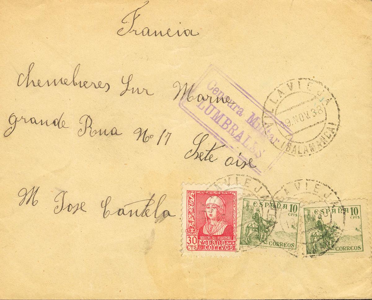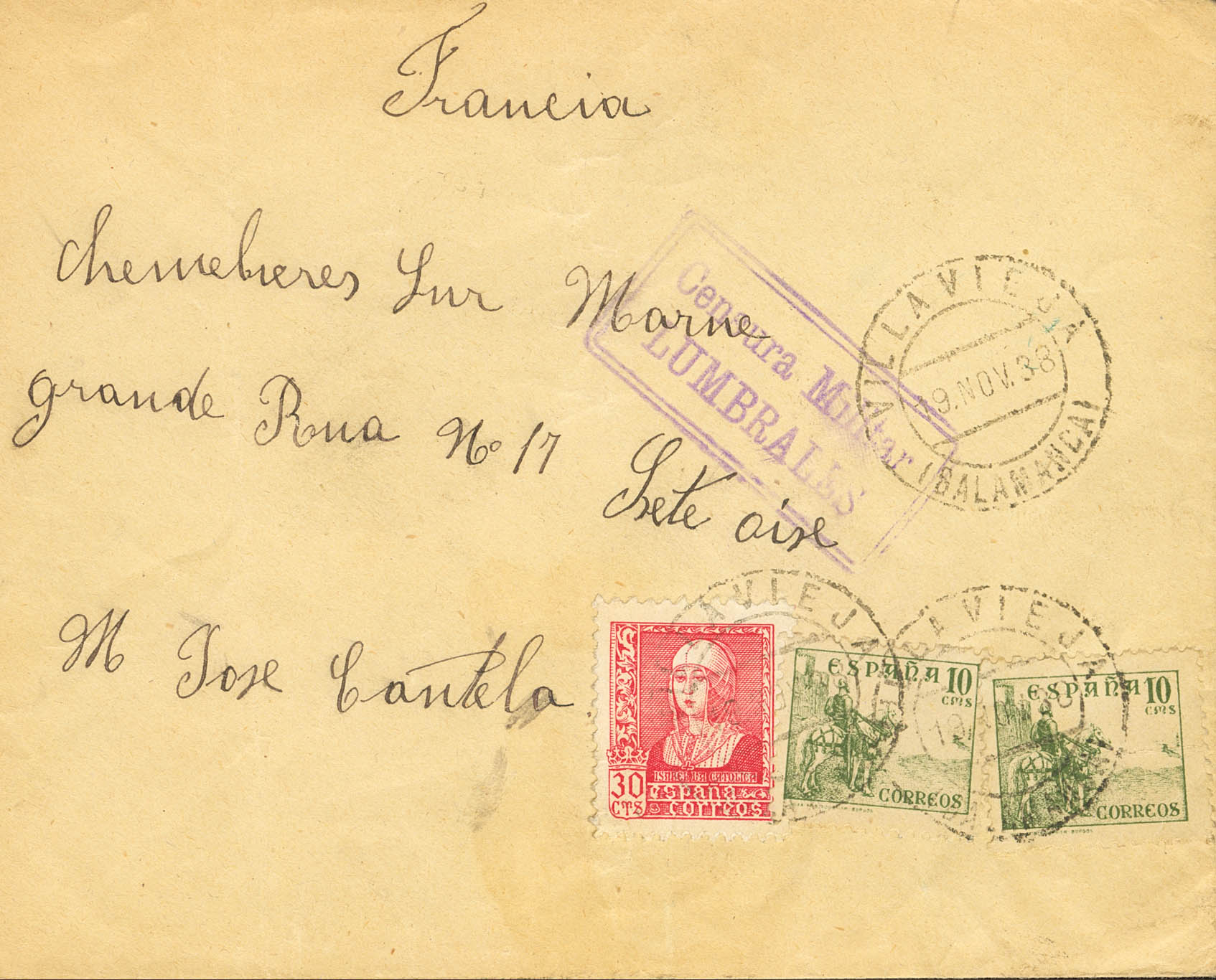 Guerra Civil. Censura Militar Bando Nacional. VILLAVIEJA a FRANCIA. CENSURA MILITAR / LUMBRALES, de Salamanca. MAGNIFICA.