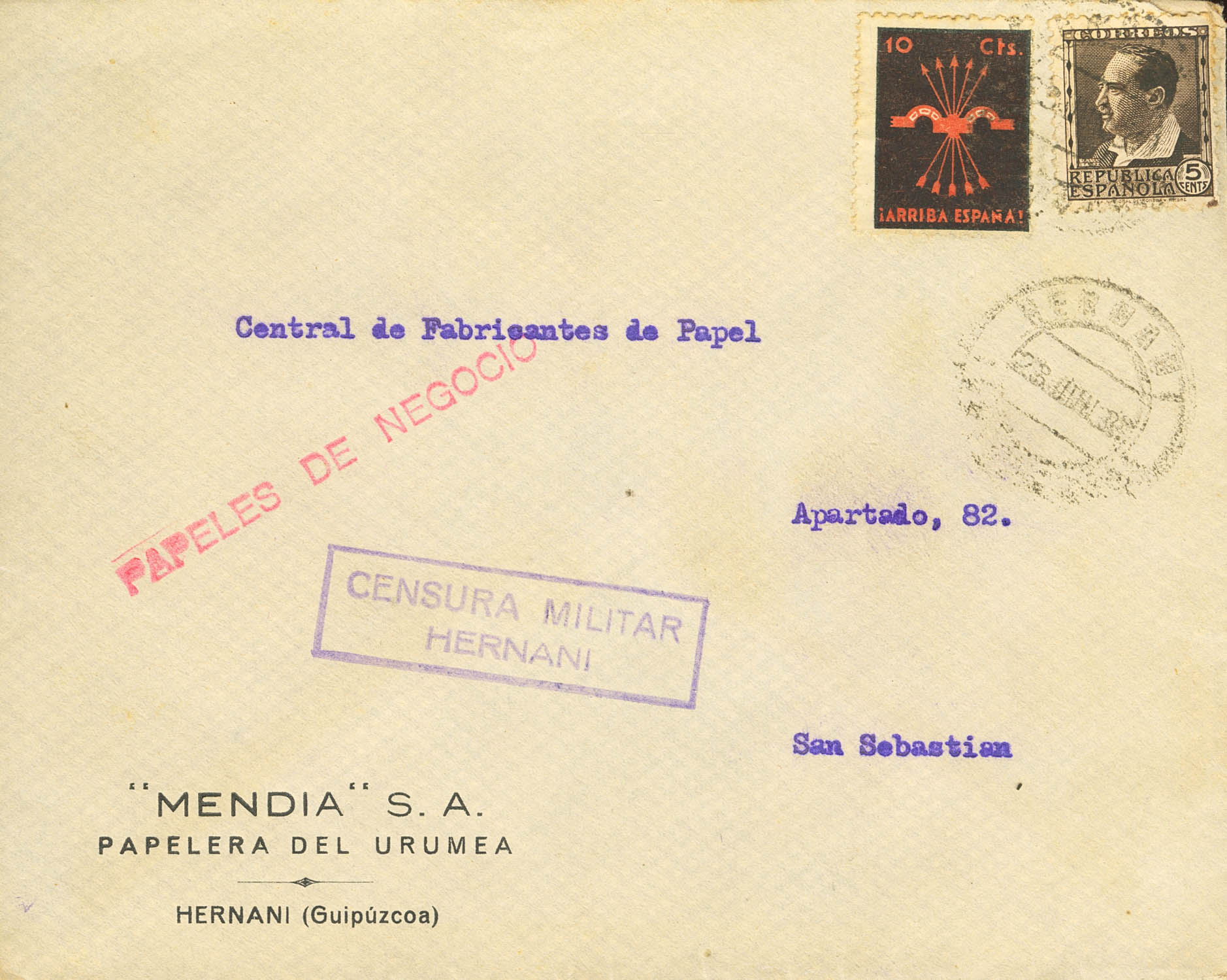 Guerra Civil. Censura Militar Bando Nacional. CENSURA MILITAR / HERNANI, de Guipúzcoa. MAGNIFICA.