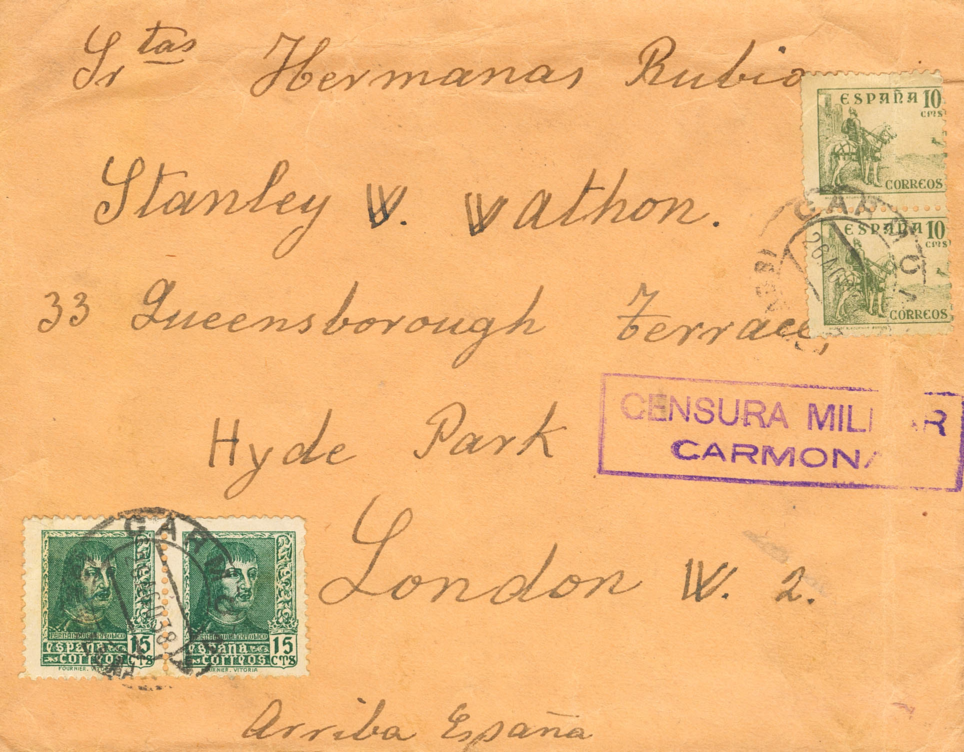 Guerra Civil. Censura Militar Bando Nacional. CENSURA MILITAR / CARMONA, de Sevilla. MAGNIFICA.