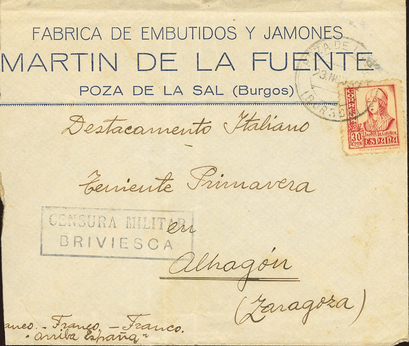 Guerra Civil. Censura Militar Bando Nacional. POZA DE LA SAL. CENSURA MILITAR / BRIVIESCA. MAGNIFICA.