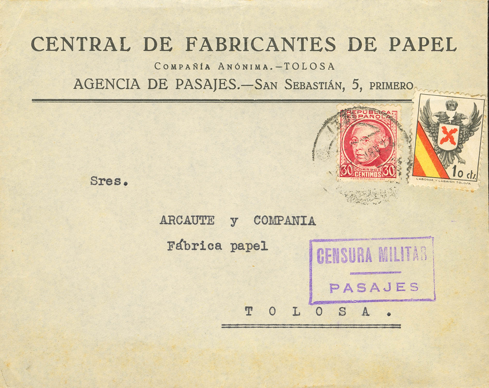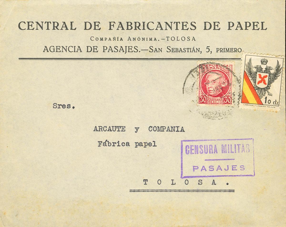 Guerra Civil. Censura Militar Bando Nacional. CENSURA MILITAR / PASAJES, en Guipúzcoa, al dorso llegada. MAGNIFICA.