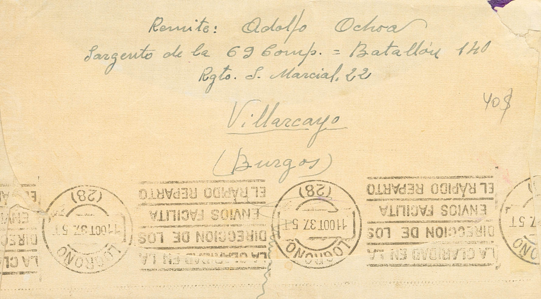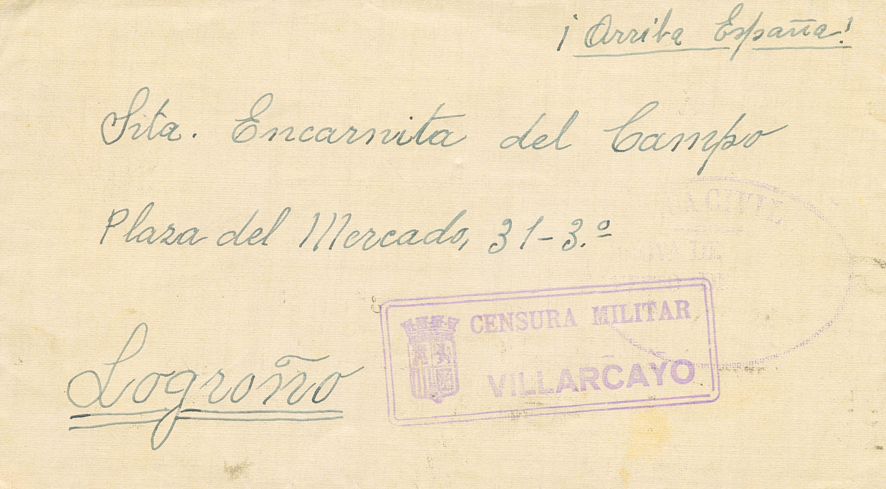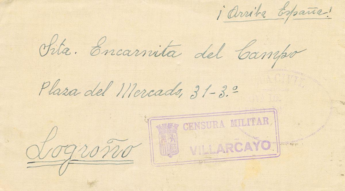 Guerra Civil. Censura Militar Bando Nacional. CENSURA MILITAR / VILLARCAYO, en Burgos, al dorso llegada. MAGNIFICA.