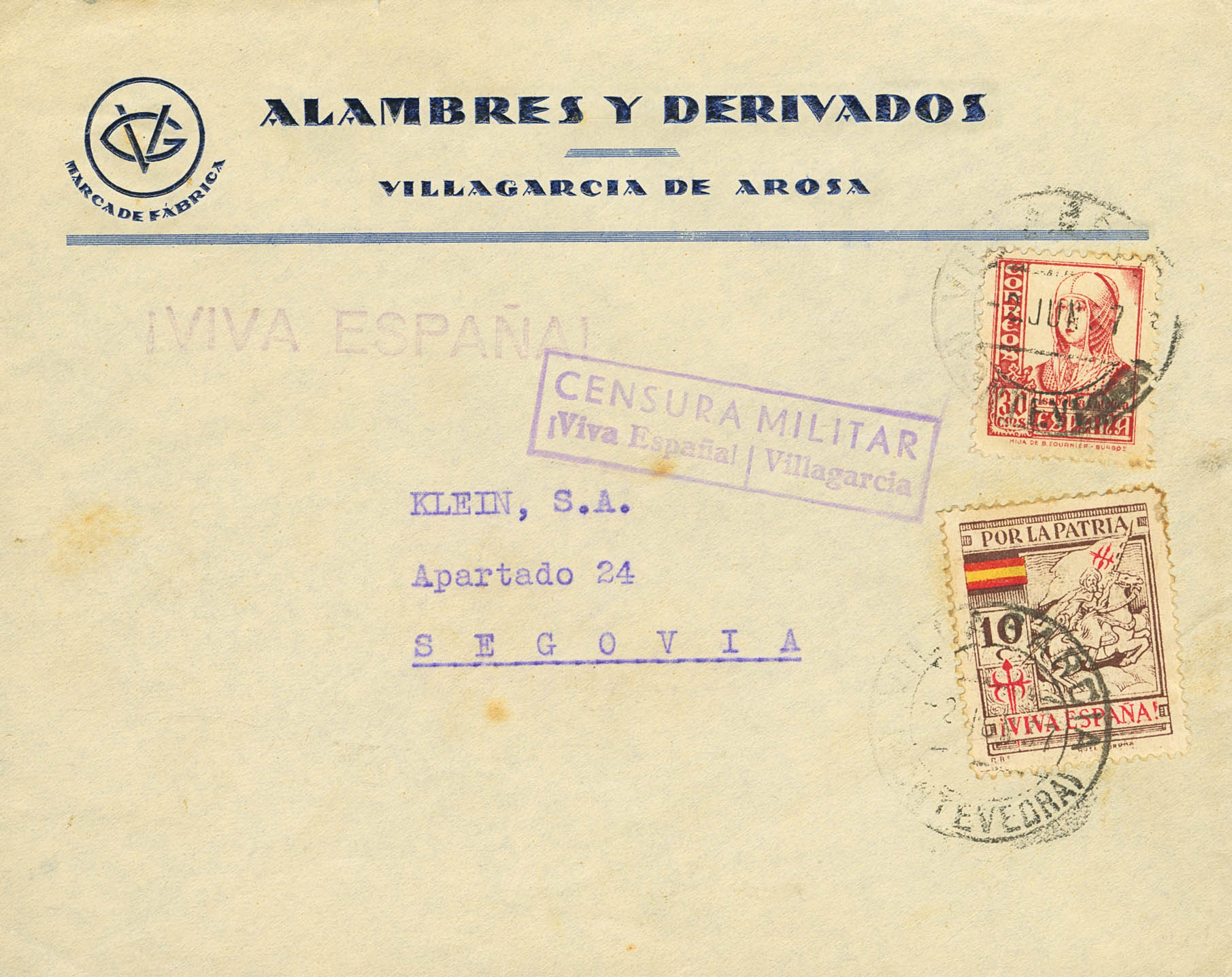 Guerra Civil. Censura Militar Bando Nacional. CENSURA MILITAR / VILLAGARCIA, en Pontevedra. MAGNIFICA.