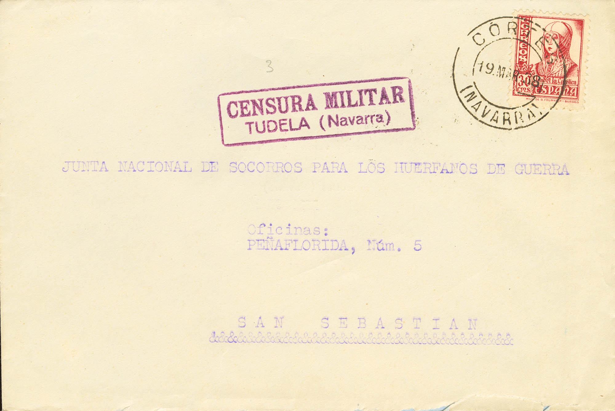 Guerra Civil. Censura Militar Bando Nacional. CORTES a SAN SEBASTIAN. CENSURA MILITAR / TUDELA (NAVARRA). MAGNIFICA.