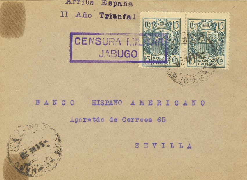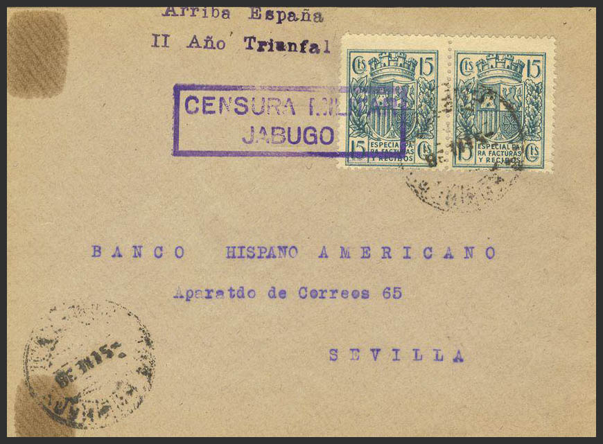 Fis 23. 1938. 15 cts, pareja FACTURAS. JABUGO a SEVILLA. Al dorso llegada. MAGNIFICA.