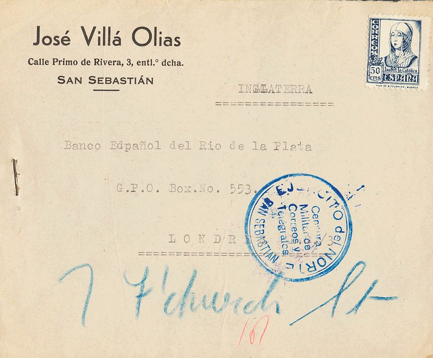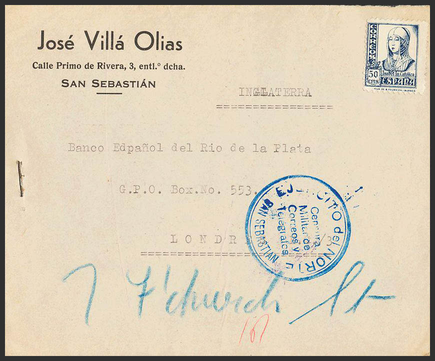 Guerra Civil. Censura Militar Bando Nacional. EJERCITO DEL NORTE / CENSURA / MILITAR DE / CORREOS Y / TELEGRAFOS / SAN SEBASTIAN. MAGNIFICA.
