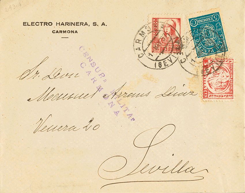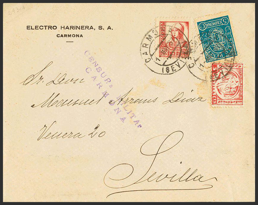 Guerra Civil. Censura Militar Bando Nacional. CARMONA / (SEVILLA), al dorso llegada. MAGNIFICA.