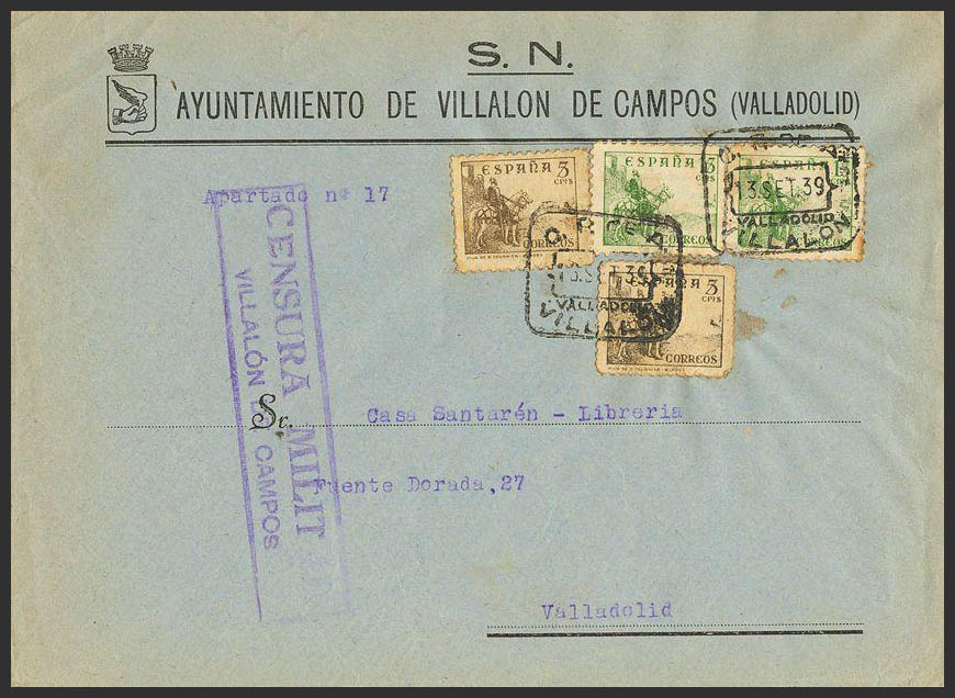Guerra Civil. Censura Militar Bando Nacional. C.P. DE A. / VALLADOLID / VILLALON. MAGNIFICA.