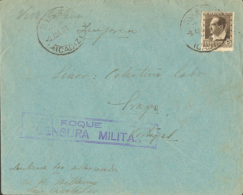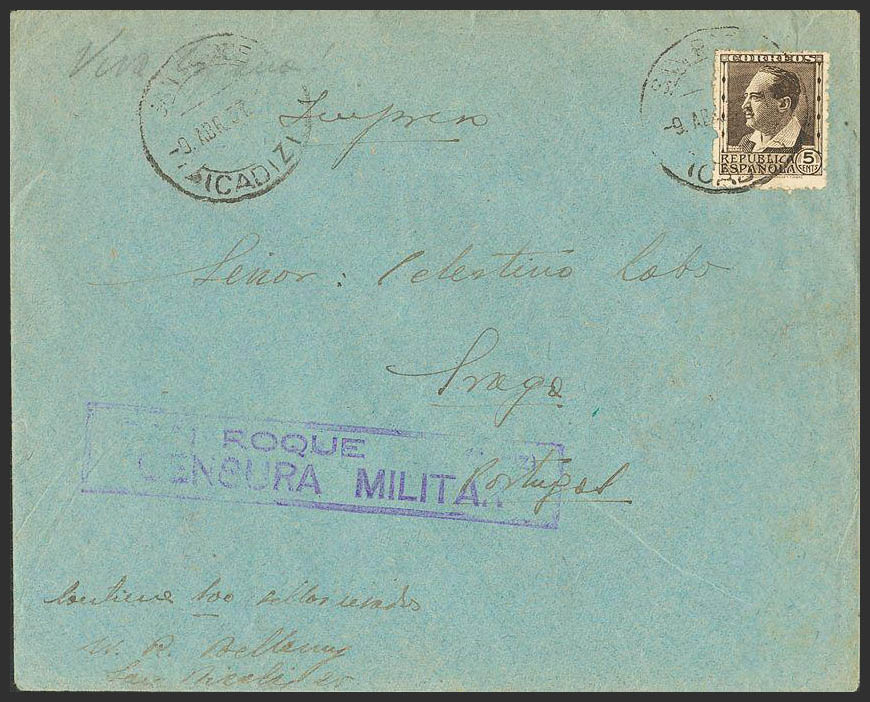 Guerra Civil. Censura Militar Bando Nacional. SAN ROQUE / (CADIZ), al dorso llegada. MAGNIFICA.