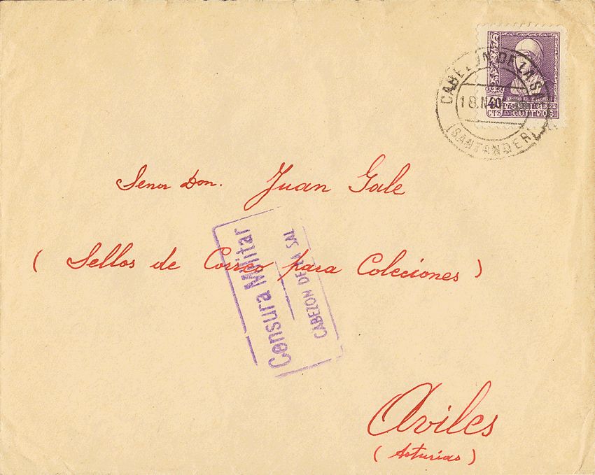Guerra Civil. Censura Militar Bando Nacional. CABEZON DE LA SAL / (SANTANDER), al dorso llegada. MAGNIFICA.