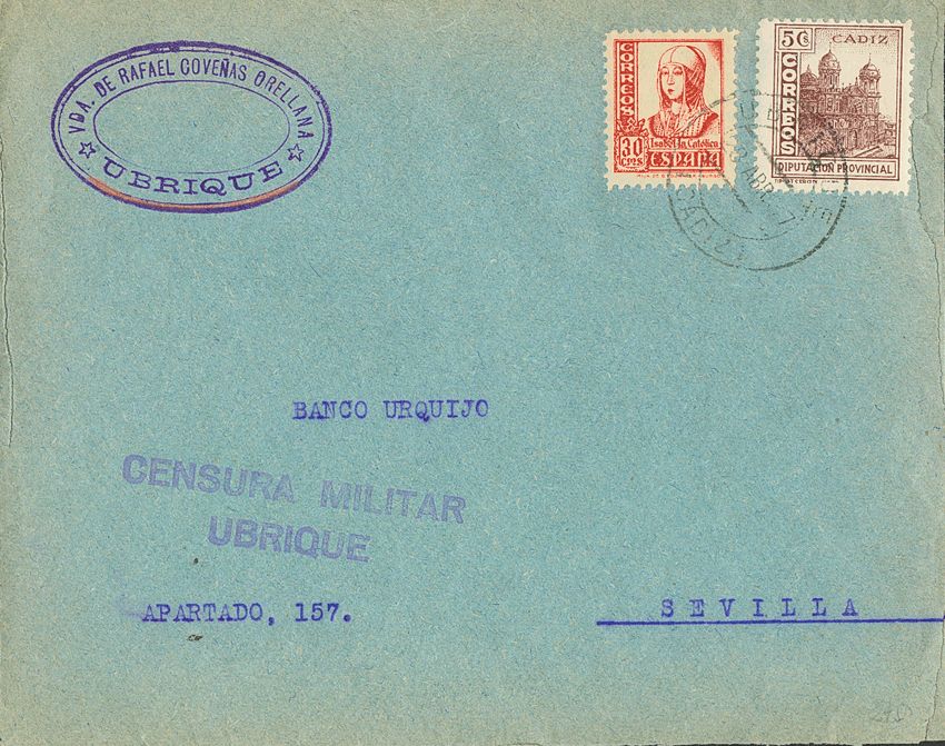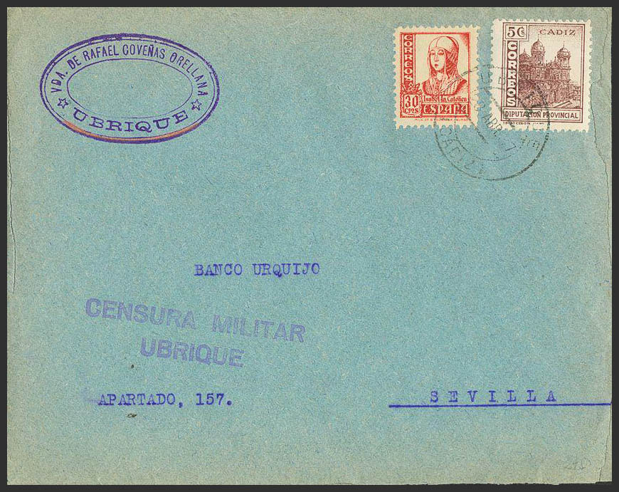 Guerra Civil. Censura Militar Bando Nacional. UBRIQUE / (CADIZ), al dorso llegada. MAGNIFICA.