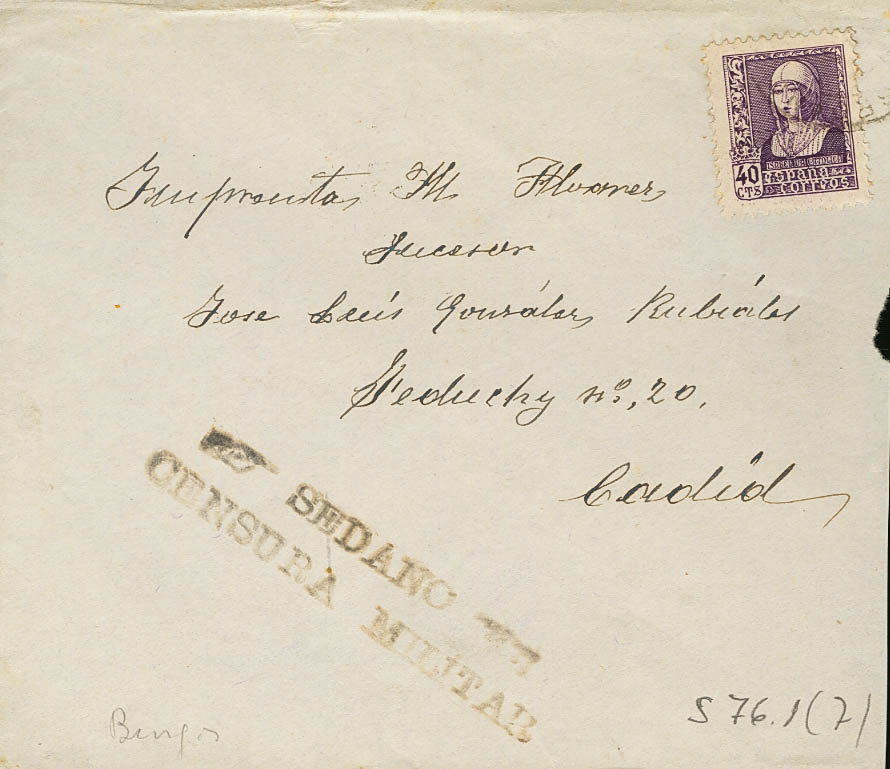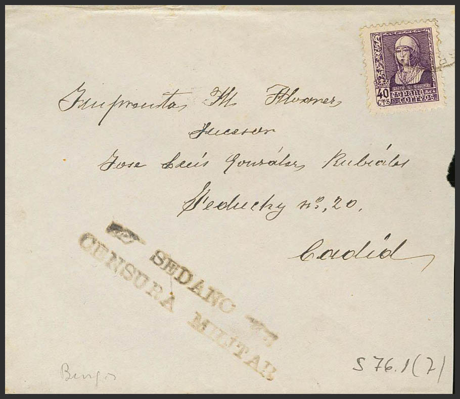 Guerra Civil. Censura Militar Bando Nacional. SEDANO / CENSURA MILITAR, al dorso llegada. MAGNIFICA.