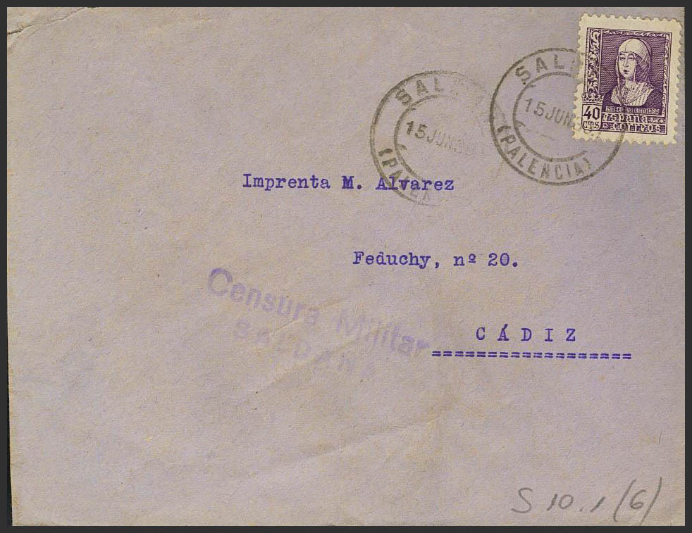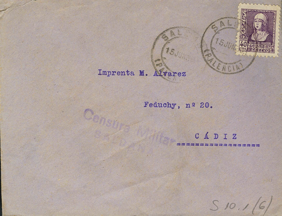 Guerra Civil. Censura Militar Bando Nacional. CENSURA MILITAR / SALDAÑA, al dorso llegada.