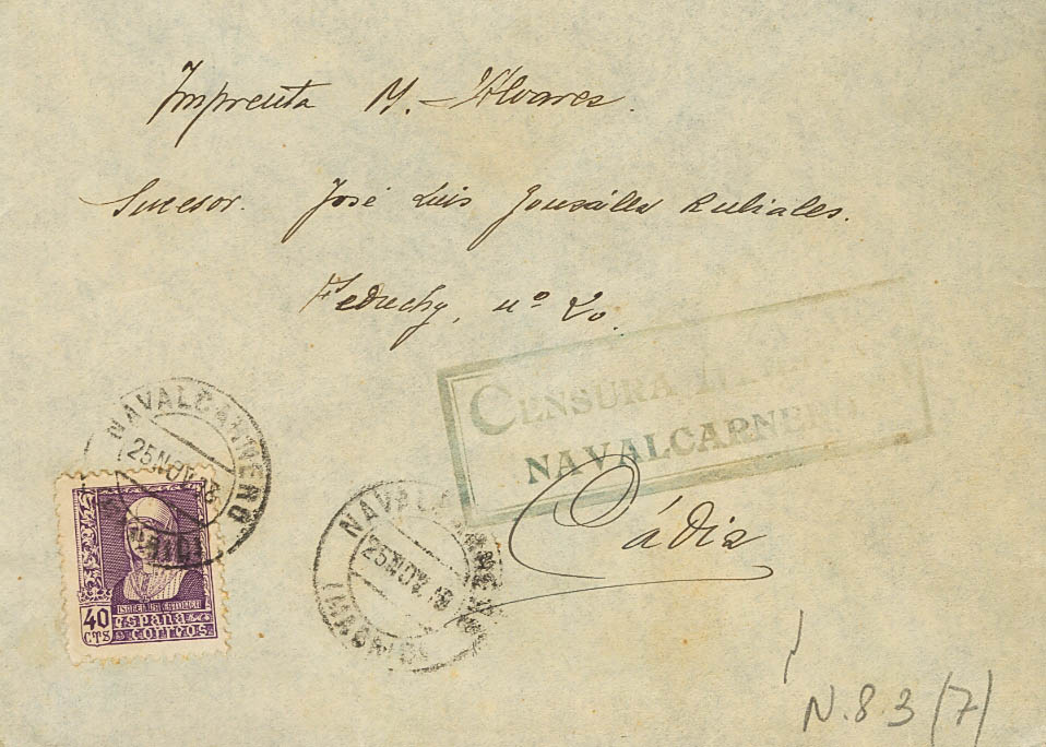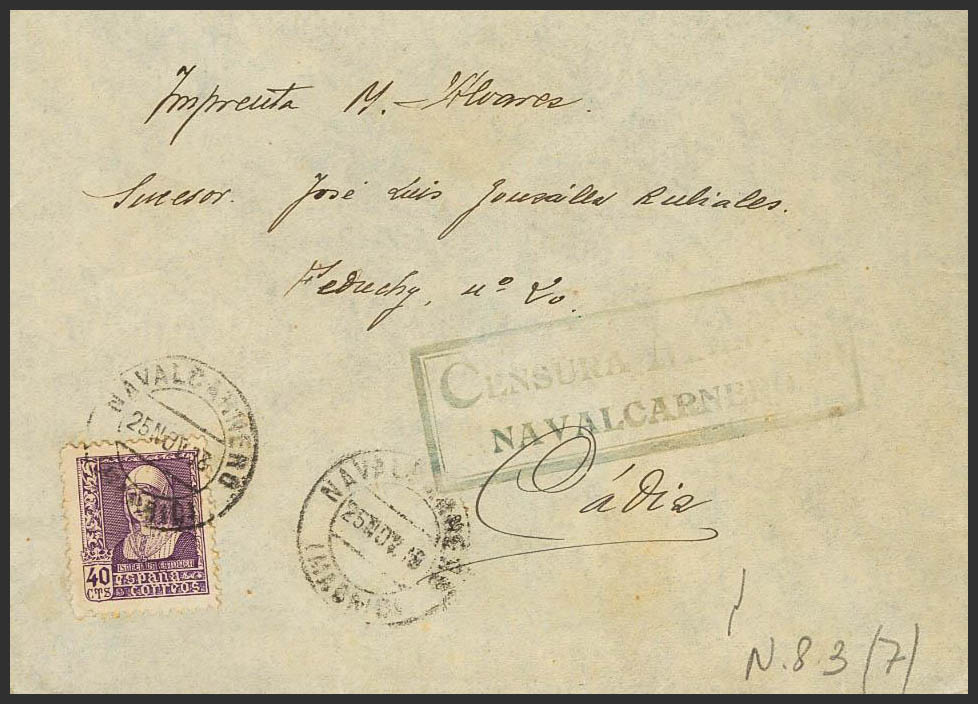 Guerra Civil. Censura Militar Bando Nacional. CENSURA MILITAR / NAVALCARNERO. MAGNIFICA Y RARA.