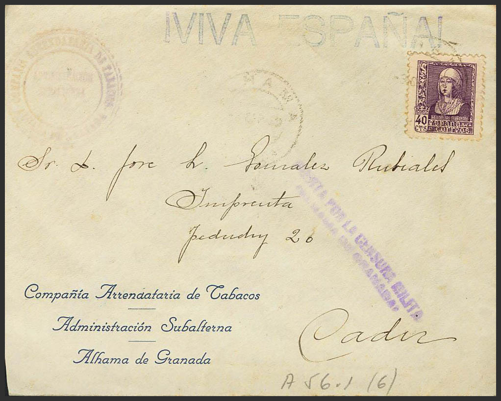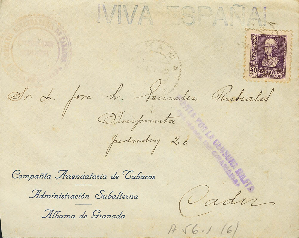 Guerra Civil. Censura Militar Bando Nacional. CENSURA MILITAR / ALHAMA DE GRANADA, al dorso llegada. MAGNIFICA.
