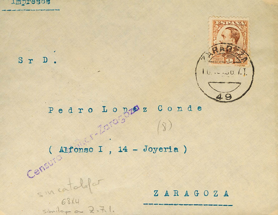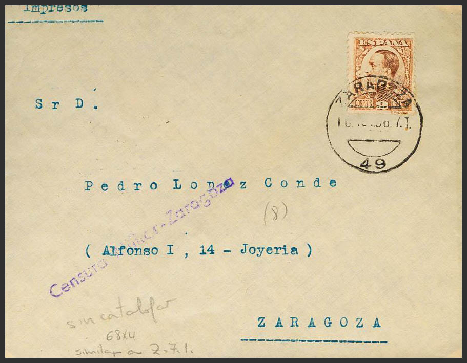 Guerra Civil. Censura Militar Bando Nacional. CENSURA MILITAR / ZARAGOZA (Franqueada con un sello de Alfonso XIII). MAGNIFICA.