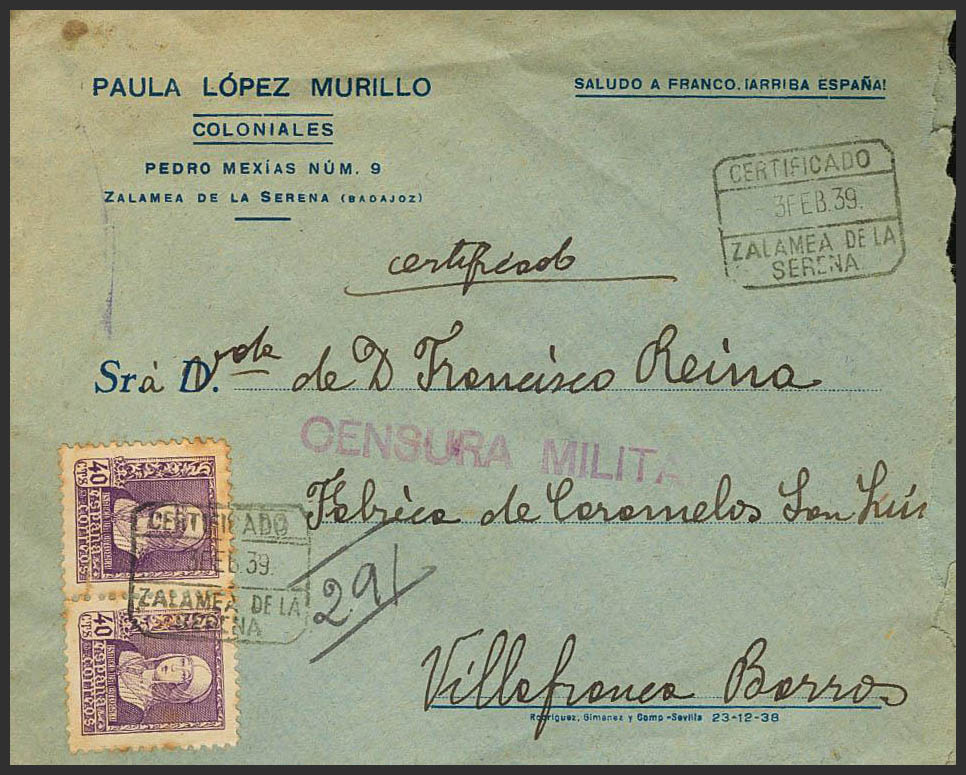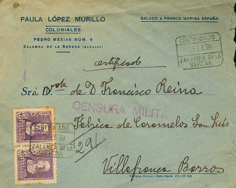 Guerra Civil. Censura Militar Bando Nacional. ZALAMEA DE LA SERENA / CERTIFICADO, al dorso llegada. MAGNIFICA.