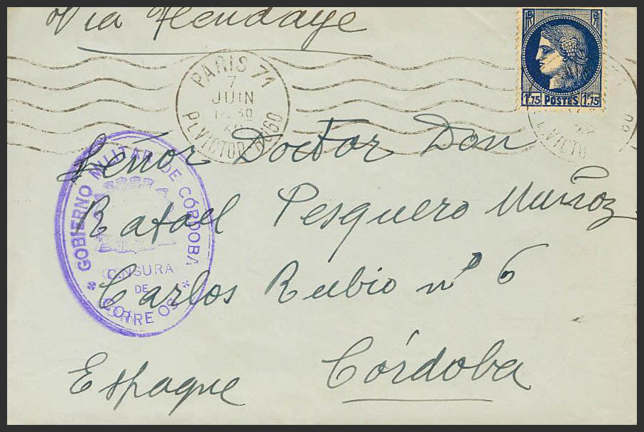 Guerra Civil. Censura Militar Bando Nacional. GOBIERNO MILITAR DE CORDOBA / CENSURA DE CORREOS, al dorso llegada. MAGNIFICA.