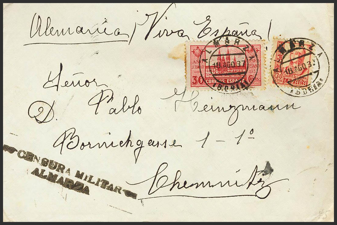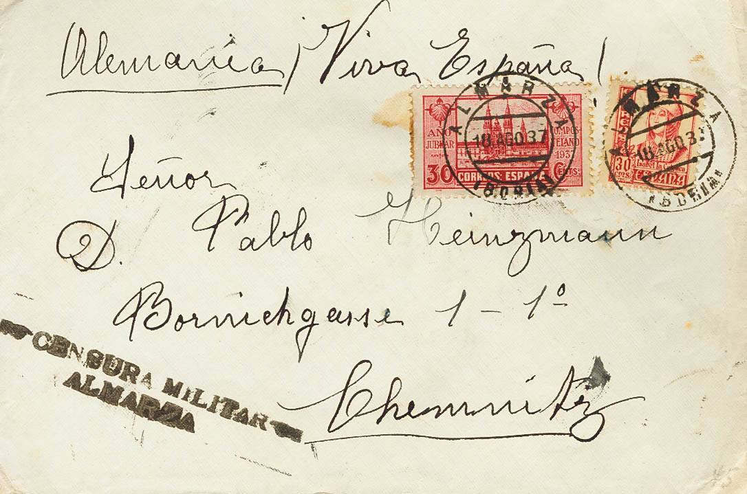 Guerra Civil. Censura Militar Bando Nacional. ALMARZA / SORIA, al dorso llegada. MAGNIFICA.