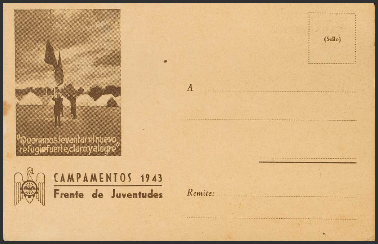 (★)1943. Tarjeta Postal del frente de Juventudes. Campamentos 1943. MAGNIFICA Y MUY RARA.