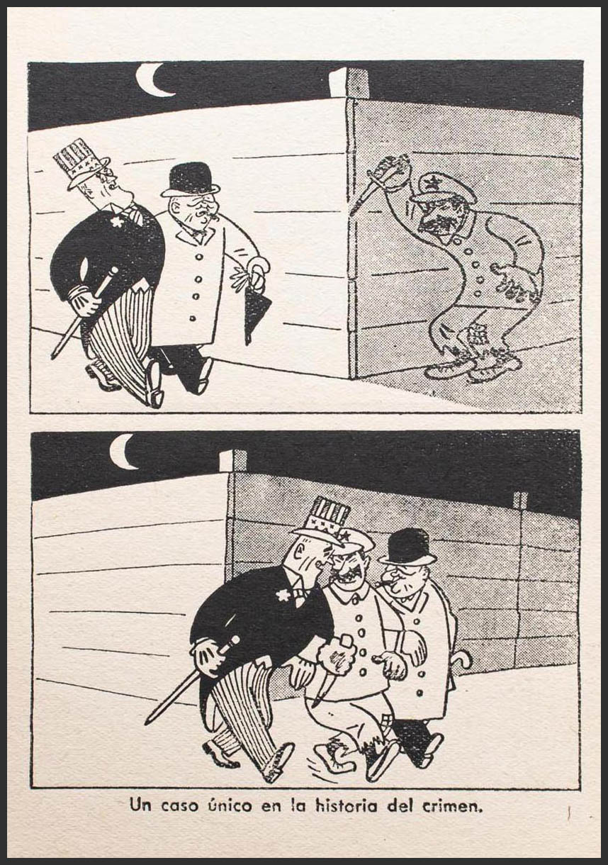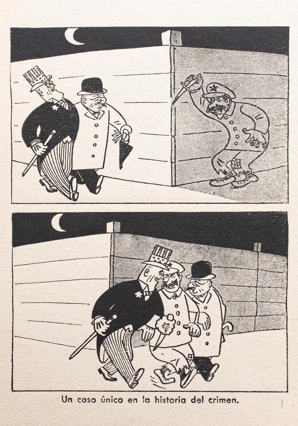 (★)(1943ca). Tarjeta Postal Ilustrada con las caricaturas de Roosevelt, Churchill y Stalin "Un caso único en la historia del crimen", realizada por grupos anticomunistas. MAGNIFICA.