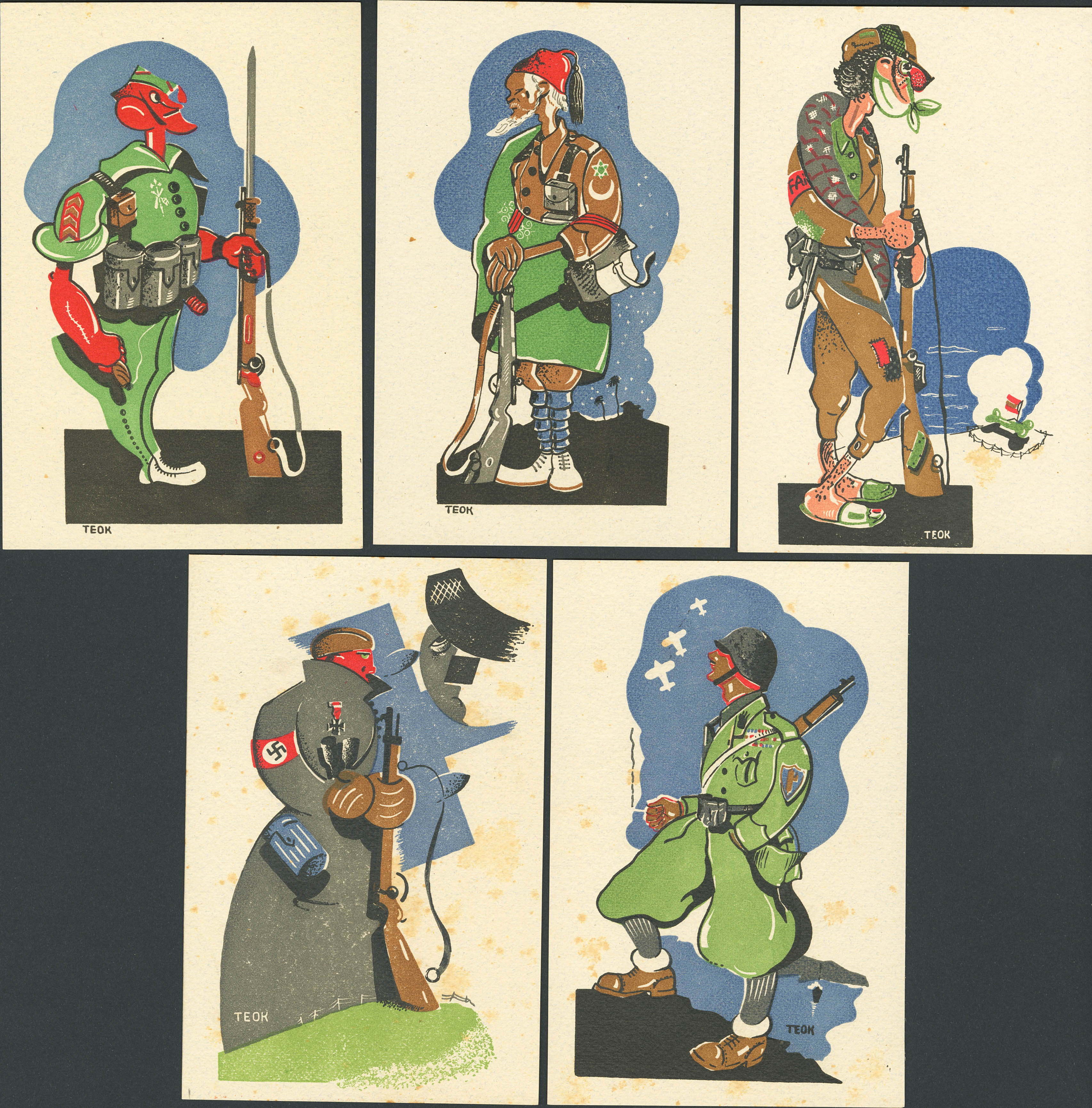 (★)(1937ca). Juego completo de diez tarjetas postales realizadas por TEOK con caricaturas de soldados y enfermeras del Bando Nacional. BONITAS. (Allepuz 518/27)