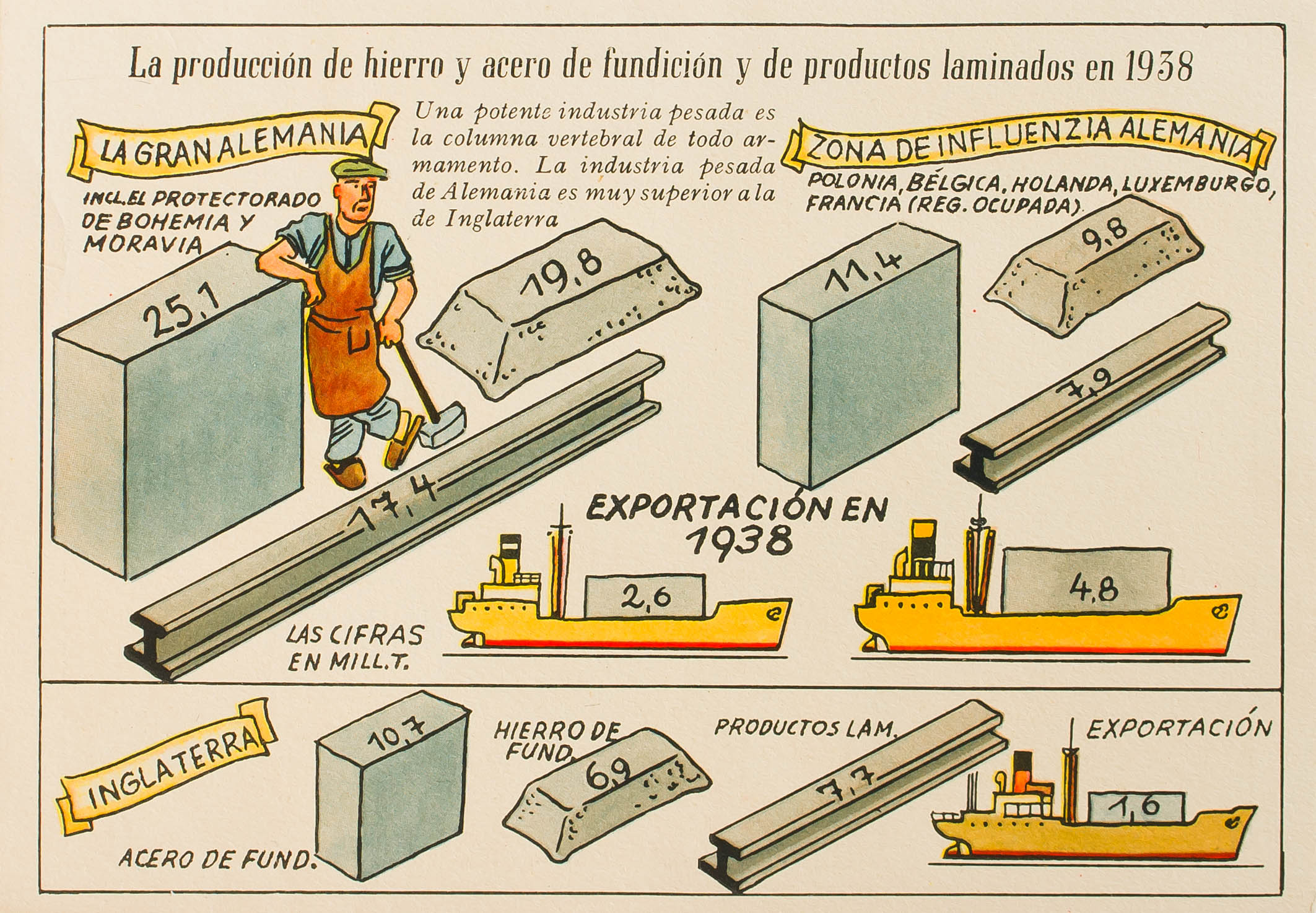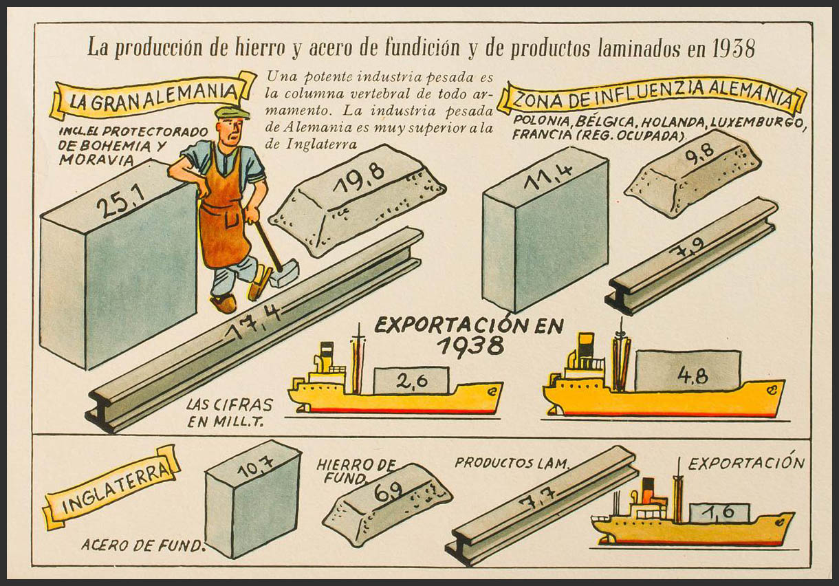 (1937ca). Tarjeta Postal Ilustrada de LA PRODUCCION DE HIERRO Y ACERO DE FUNDICION Y DE PRODUCTOS LAMINADOS EN 1938. MAGNIFICA Y RARA.