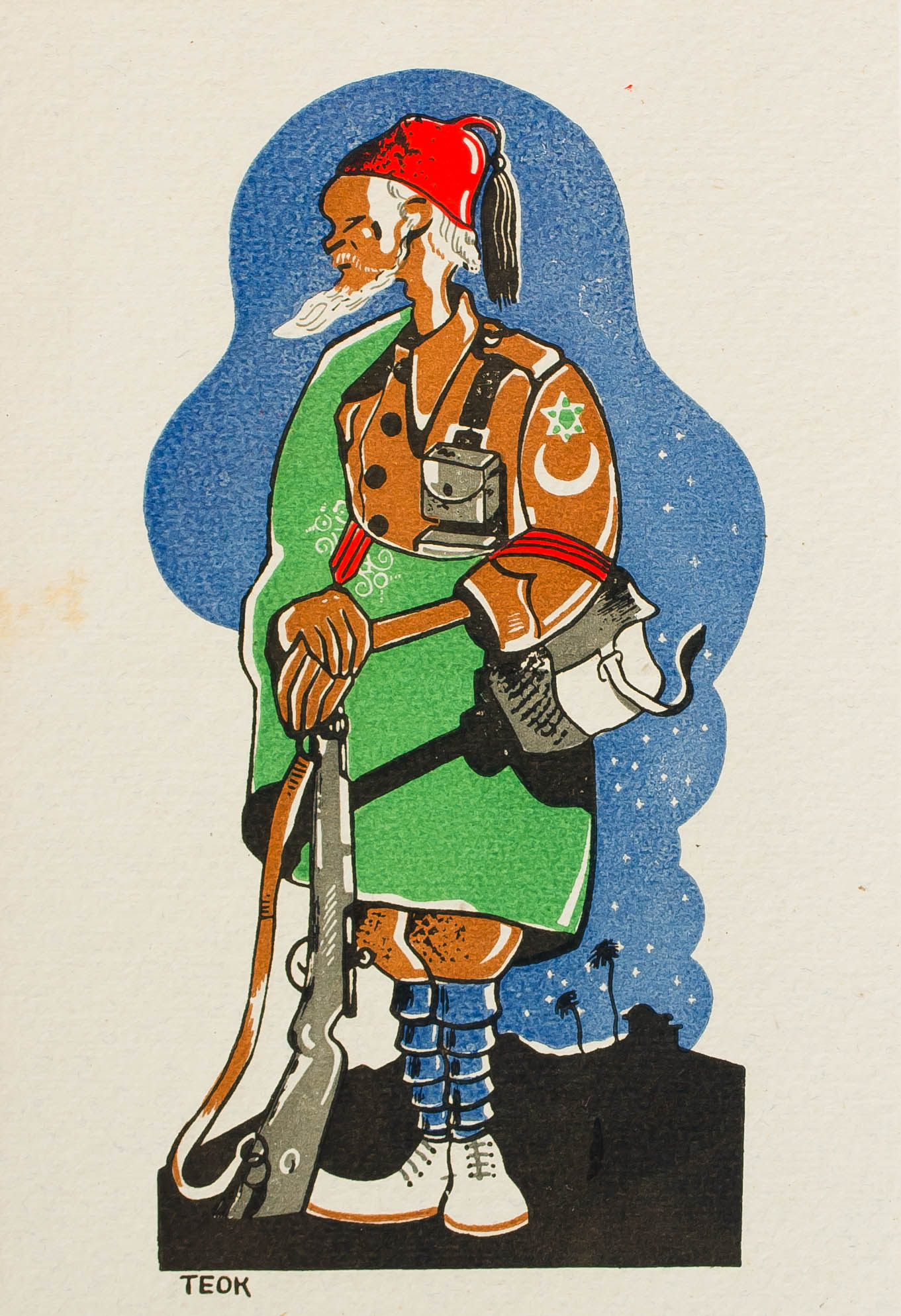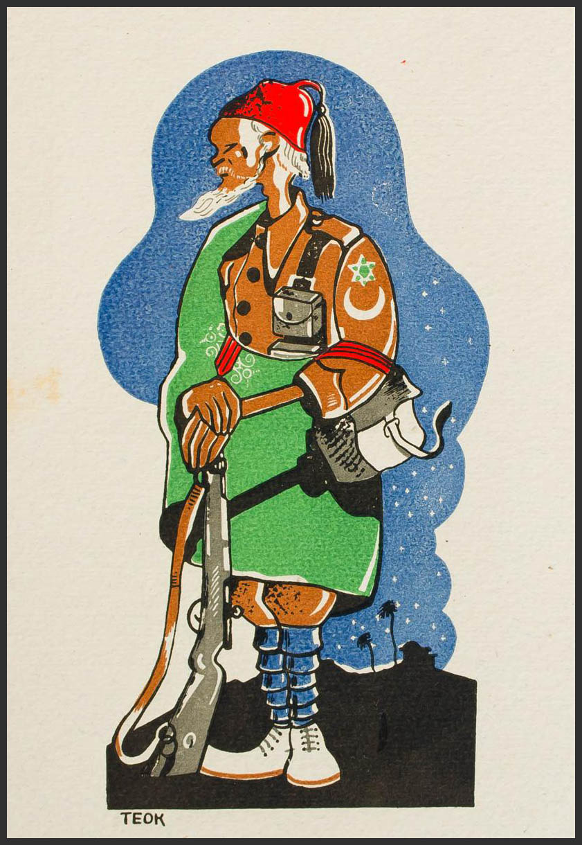 (1937ca). Tarjeta Postal Ilustrada con caricatura SOLDADO REGULAR (Teok). MAGNIFICA.