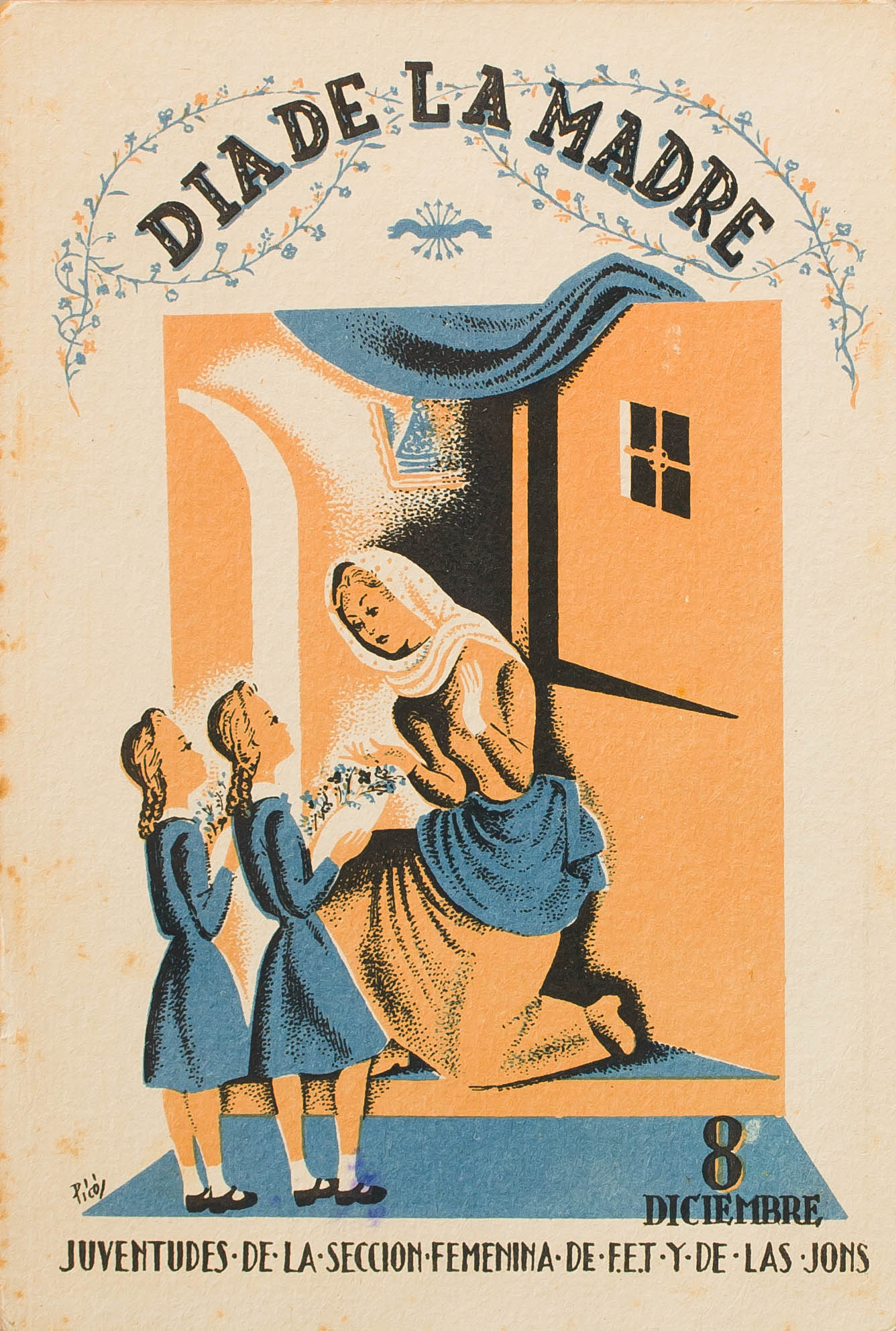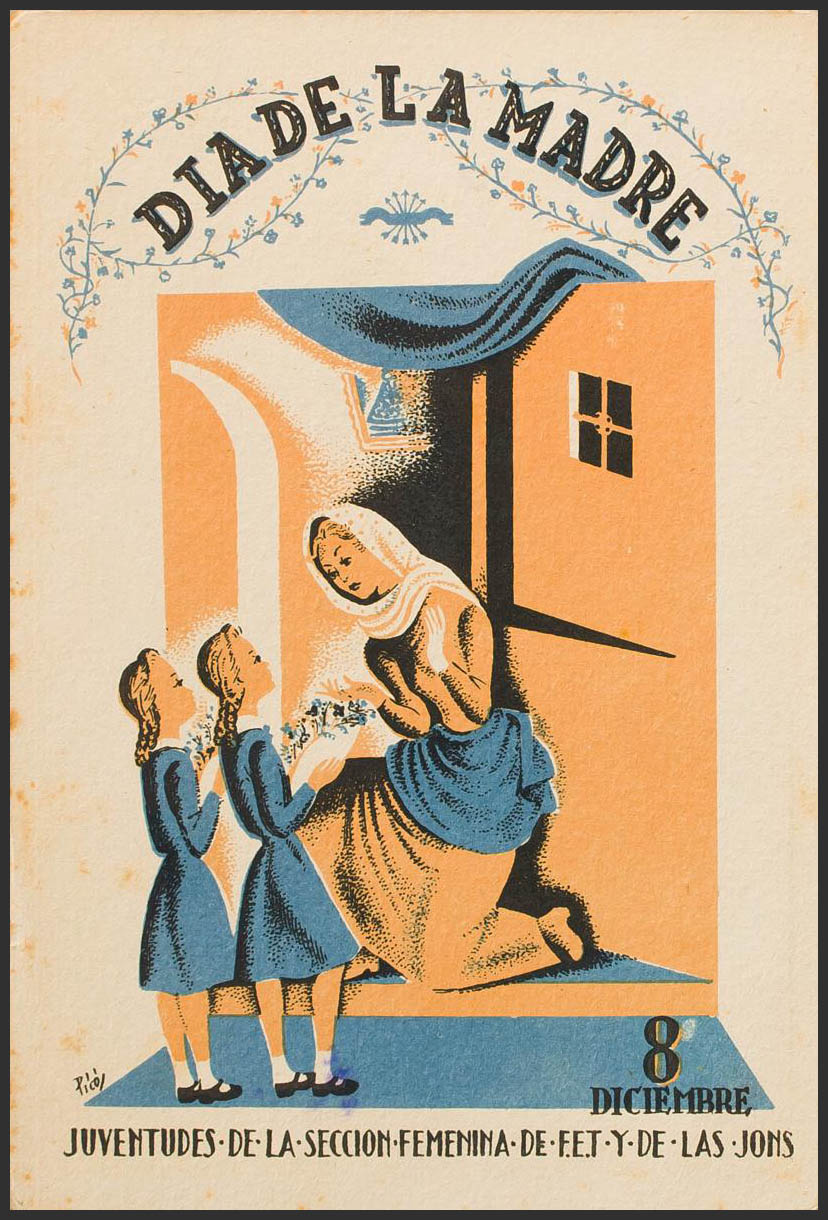 (1937ca. Tarjeta Postal Ilustrada de la SECCION FEMENINA DE FET Y DE LAS J.O.N.S. DIA DE LA MADRE. BONITA.