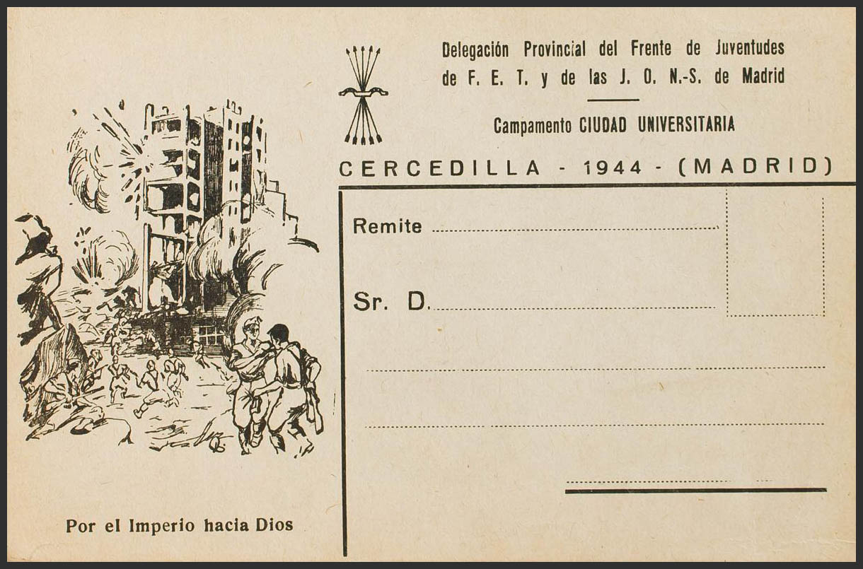 1944. Tarjeta Postal Ilustrada del FRENTE DE JUVENTUDES DE F.E.T. Y DE LAS J.O.N.S. CAMPAMENTO CIUDAD UNIVERSITARIA. MAGNIFICA.