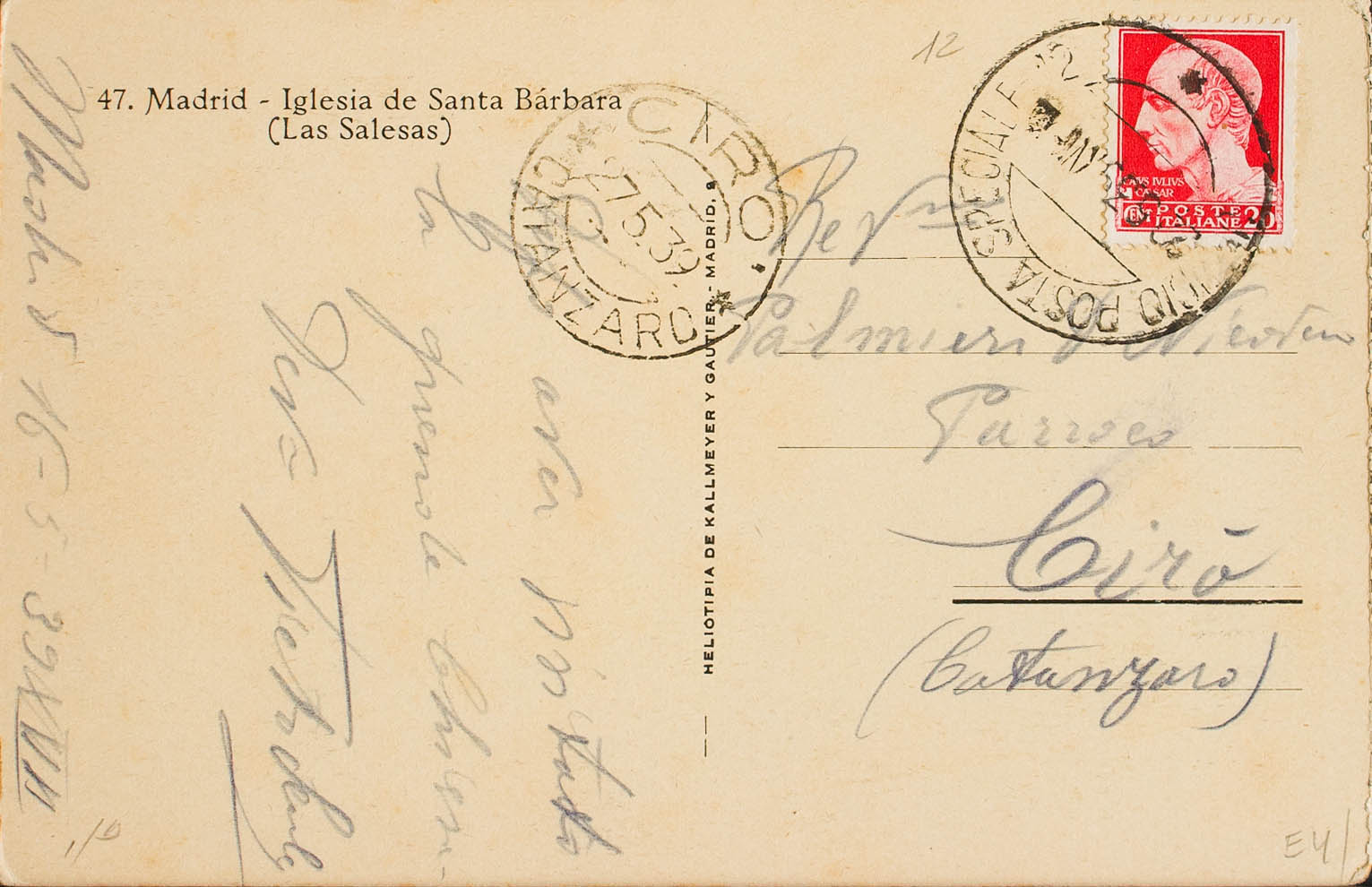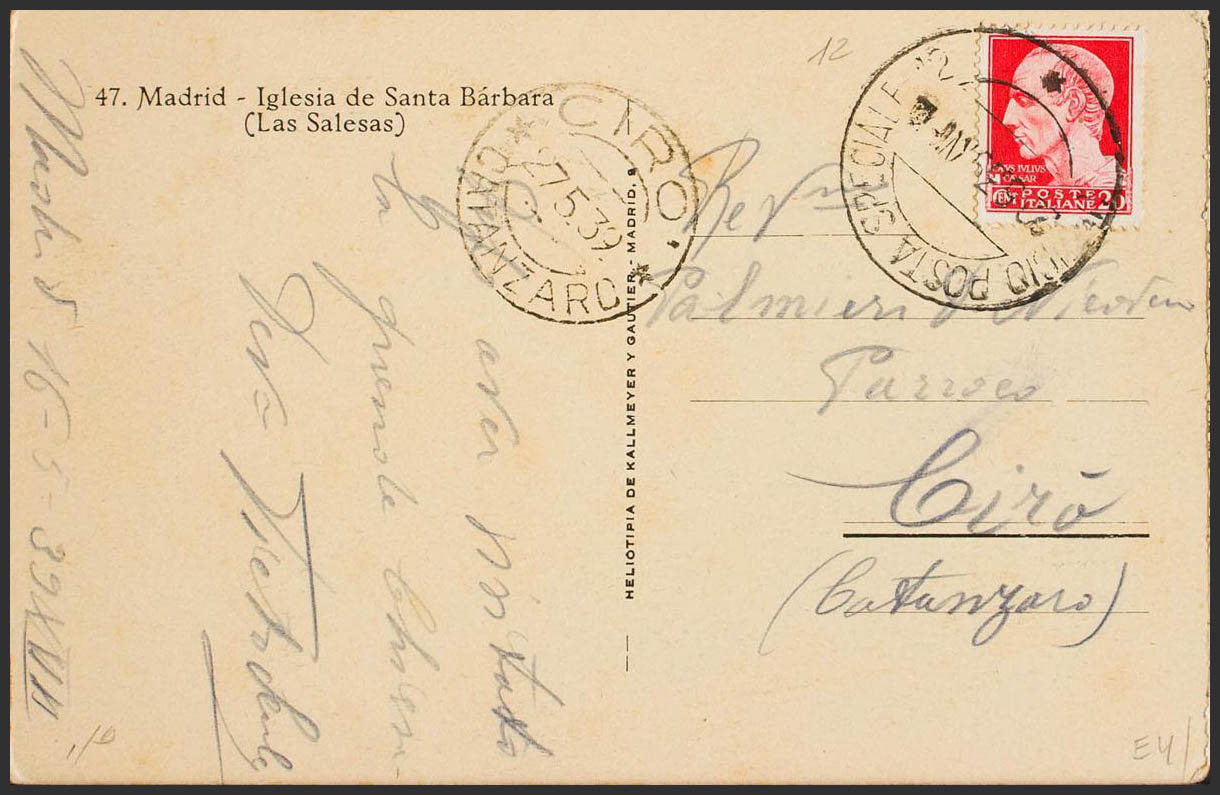 1939. 20 cts rojo de Italia. MADRID a CIRO (ITALIA). Fechador UFFICIO POSTA SPECFIALE Nº2 (escrita un mes después del final de la Guerra Civil). MAGNIFICA Y RARA.