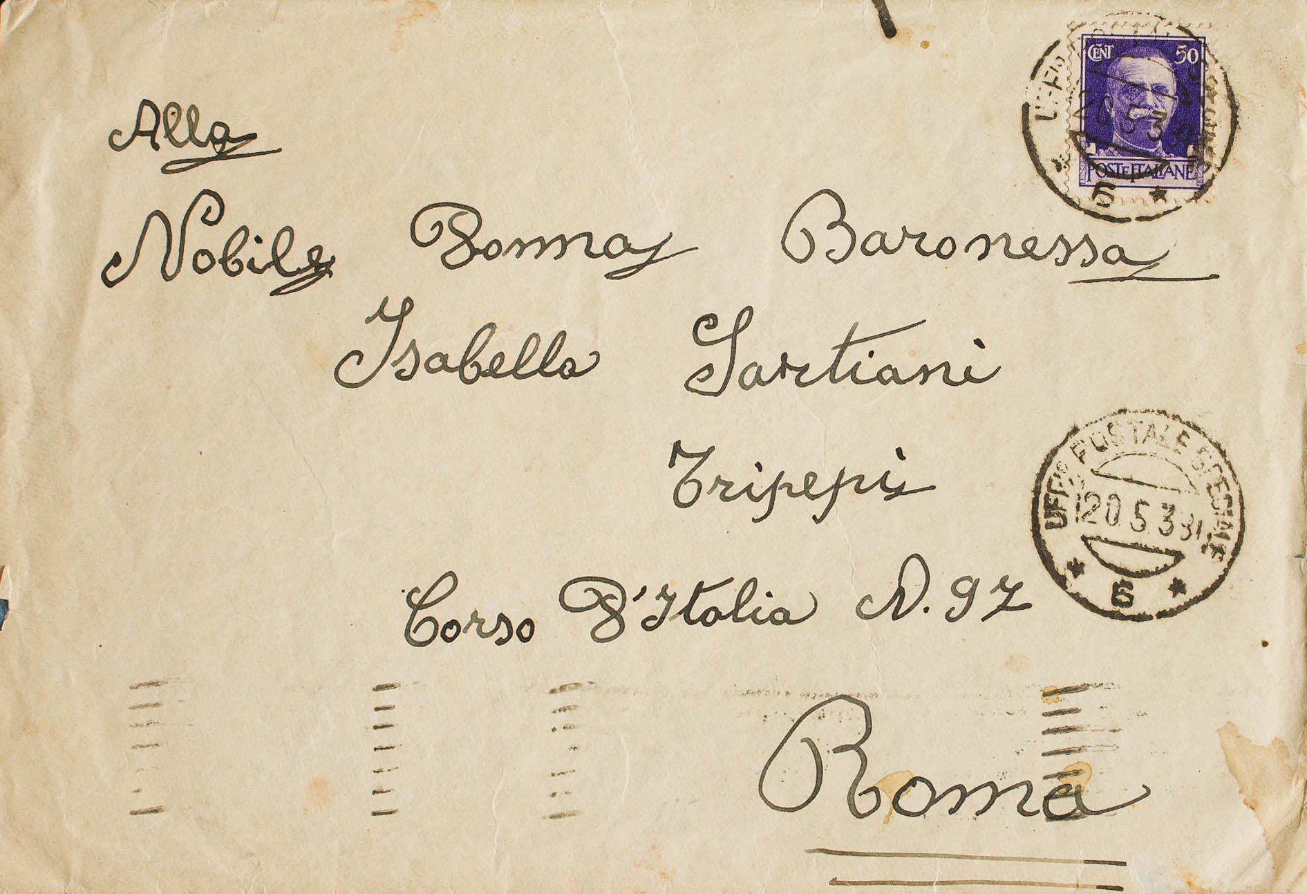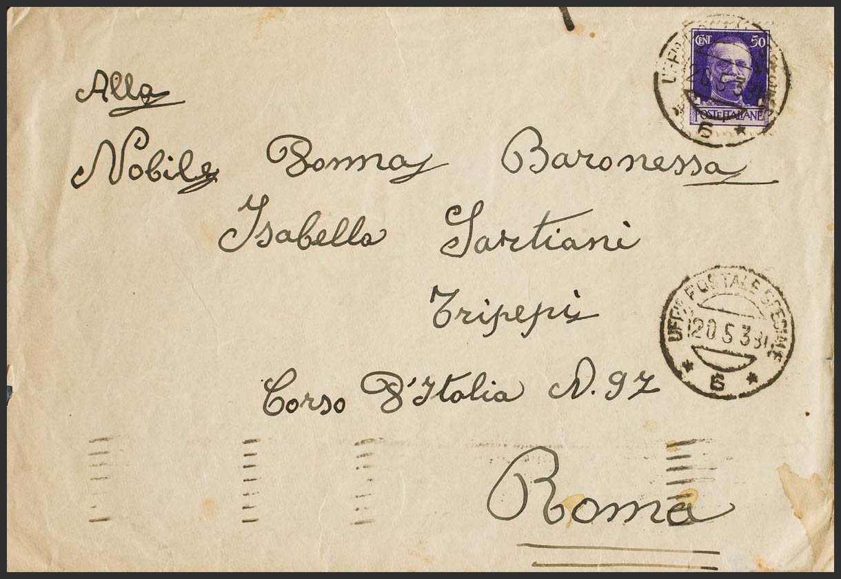 1938. 50 cts violeta de Italia. Dirigida a ROMA (ITALIA). Fechador UFFIO POSTALE SPECIALE / *6*, al dorso llegada. MAGNIFICA.