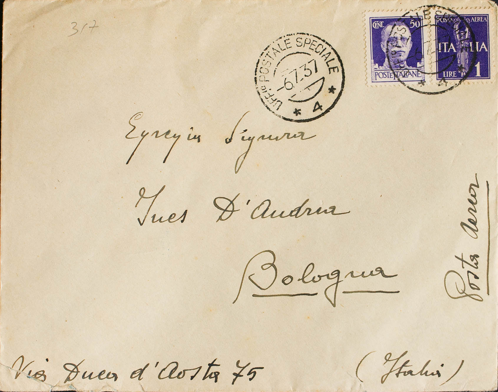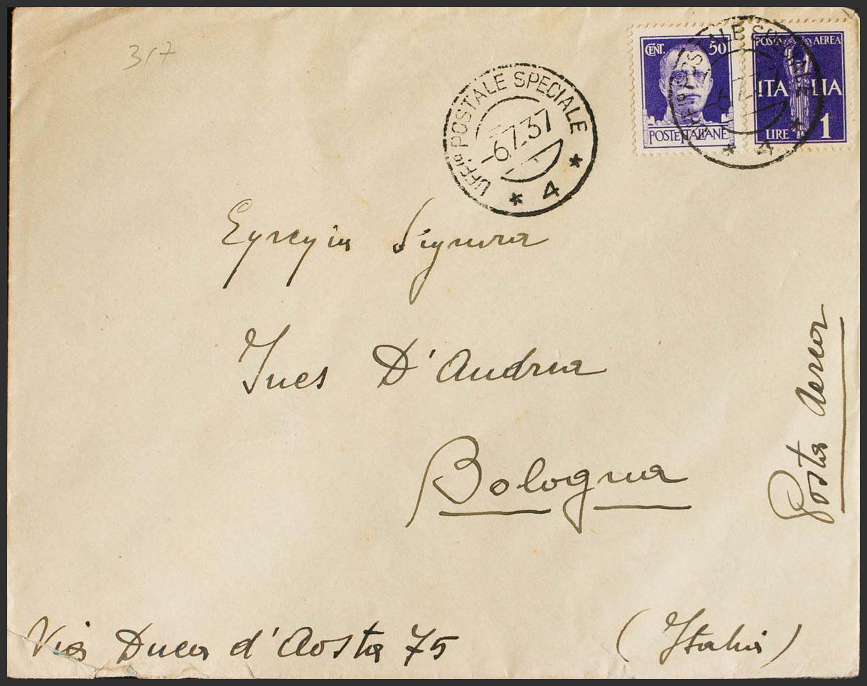 1937. 50 cts violeta y 1 lira violeta. Correo Aéreo dirigido a BOLOGNA (ITALIA). Fechador UFFIO.POSTALE SPECIALE / *4*, al dorso llegada. MAGNIFICA.