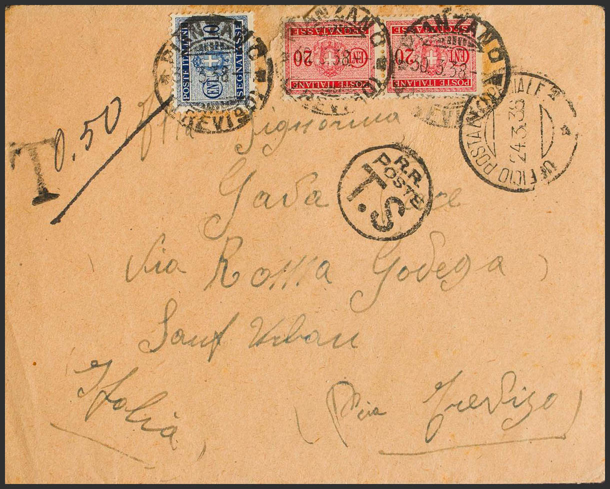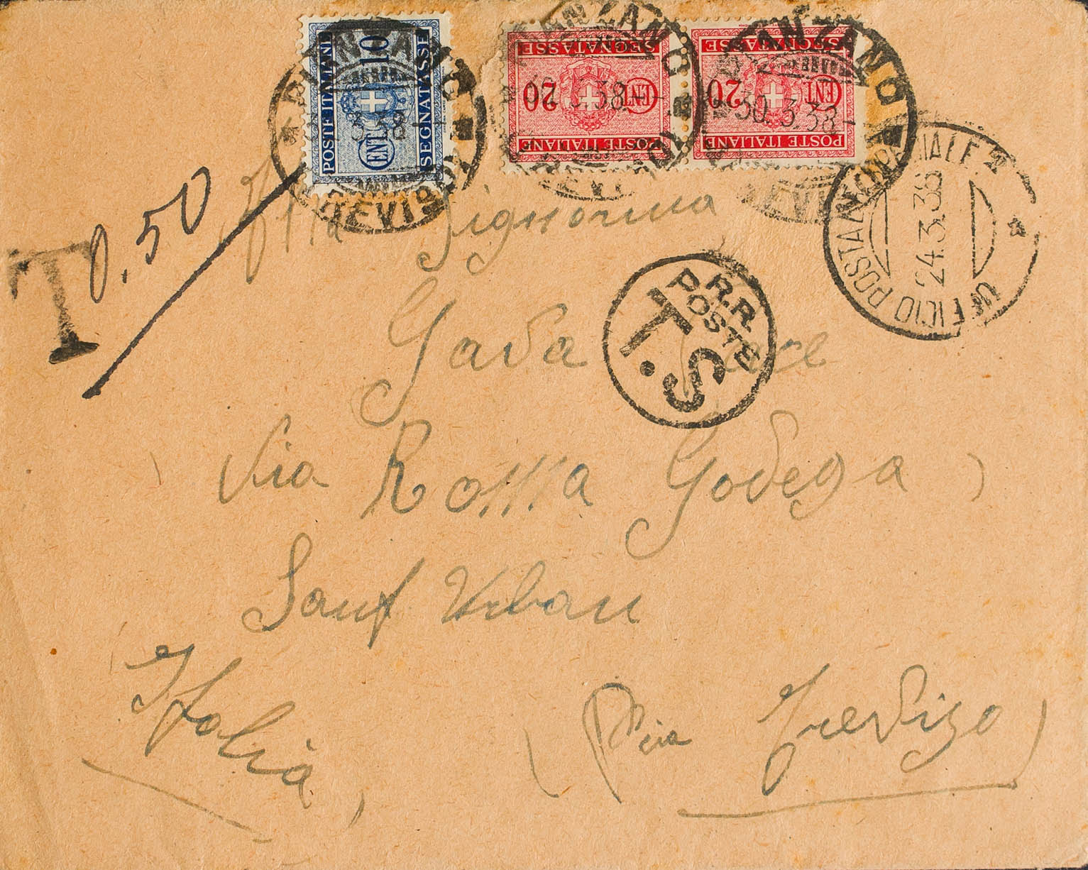 1938. Dirigida a SANT URBANO (ITALIA). Marca UFFICIO POSTA SPECIALES 2 y tasada a la llegada con 50 cts (con sellos de tasa de Italianos de 10 cts y 20 cts, dos sellos), al dorso marca COMANDO GENIO C.T.V. / 2ª COMPAGNIA ARTIERI, en violeta. MAGNIFICA Y RARA.