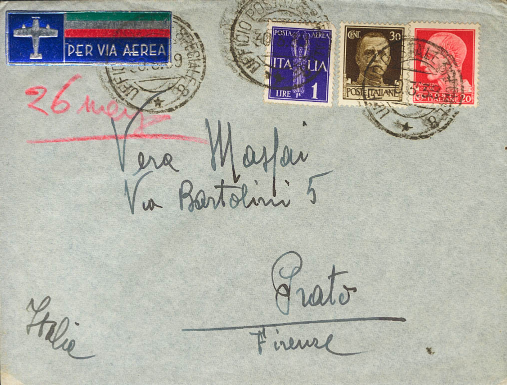1939. 20 cts rojo, 30 cts castaño y 1 lira violeta. Carta (completa) dirigida a PRATO (ITALIA), remitida por un oficial de la unidad FRECCE NERE. Matasello UFFICIO POSTALE SPECIALE 8. MAGNIFICA.