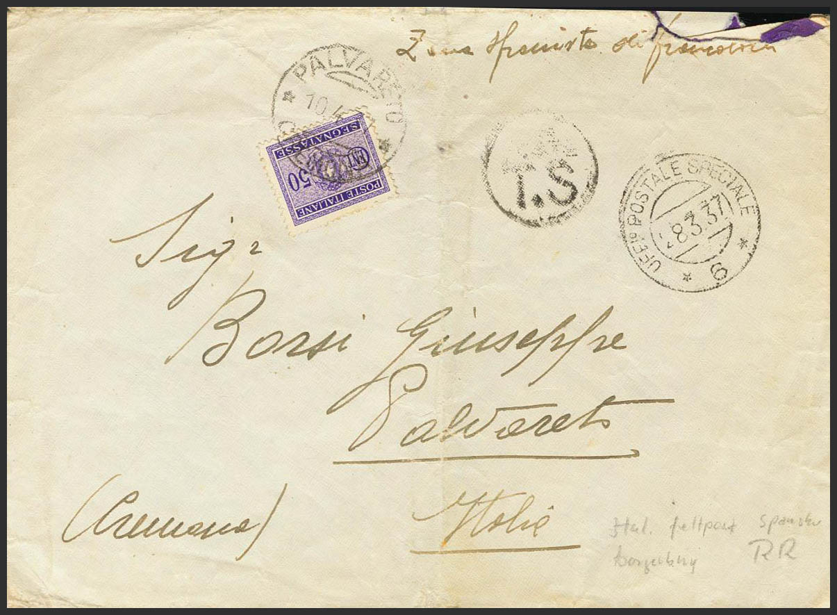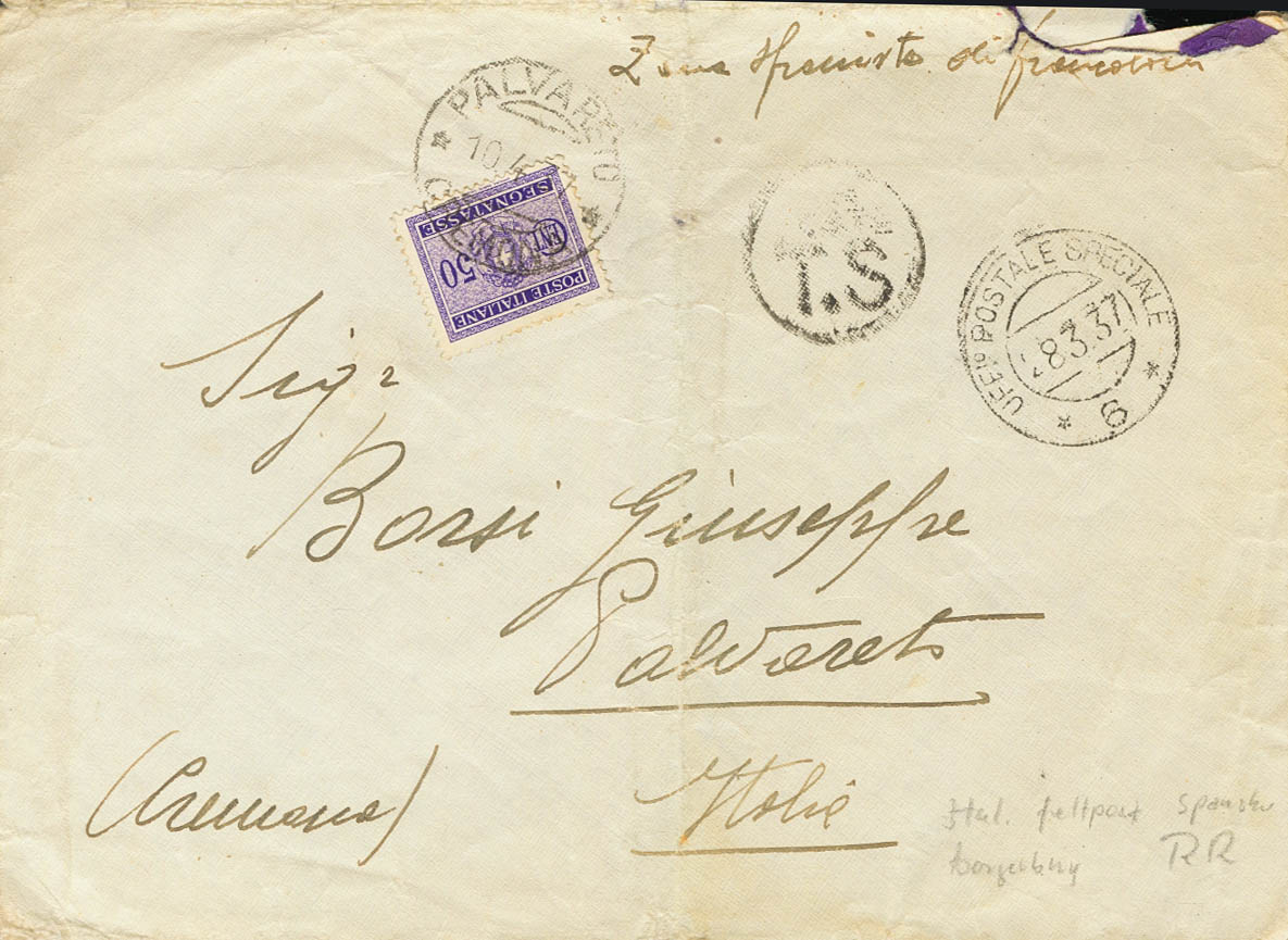 1937. Dirigida a PALVARETO (ITALIA). Tasada a la llegada, aplicando sello de tasas de 50 cts violeta, en el frente fechador UFFIº POSTALE SPECIALE / *6*, marca de tasa y manuscrito "Zona sproviste di francobolli". MAGNIFICA Y RARA.