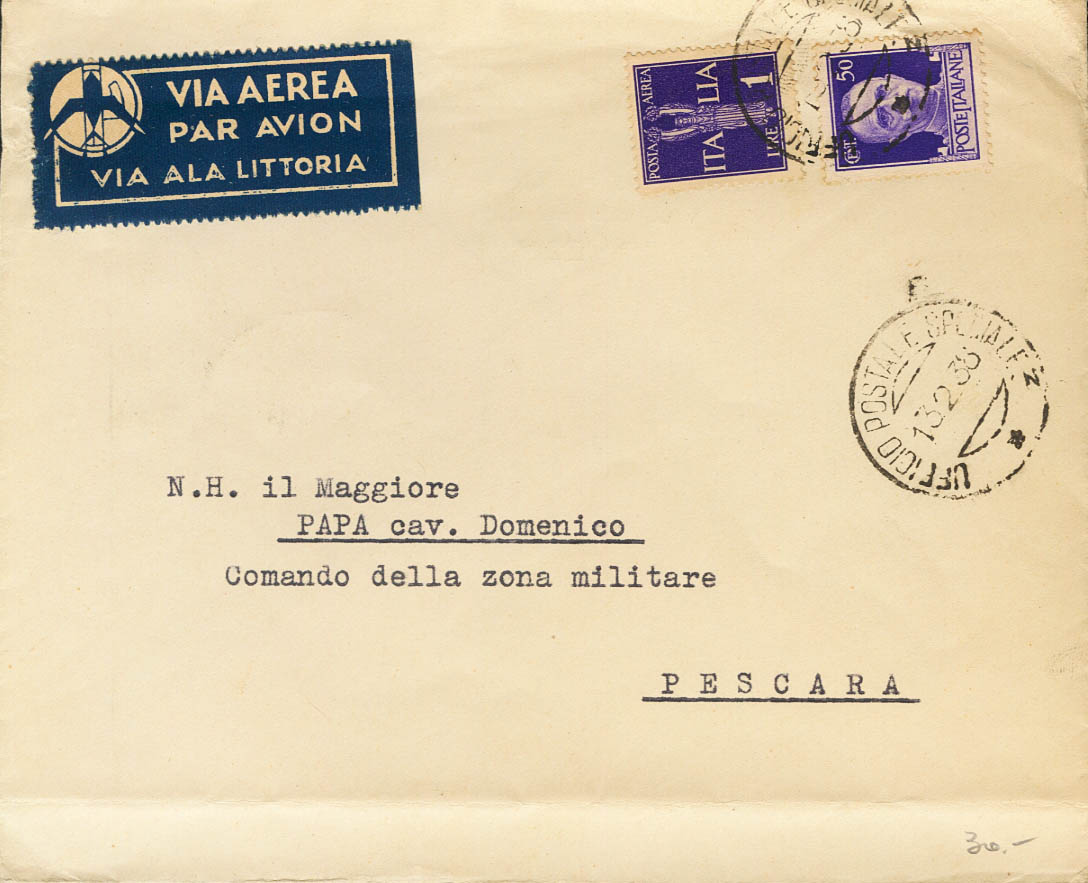 1938. 50 cts y 1 lira de Italia. Dirigida a PESCARA (ITALIA). Matasello UFFICIO POSTALE SPECIALE 3, al dorso membrete 2º REGGIMENTO FANTERIA LEGIONARIA / VOLONTARI DEL LITTORIO / OSO L´INOSABILE y llegada. MAGNIFICA.