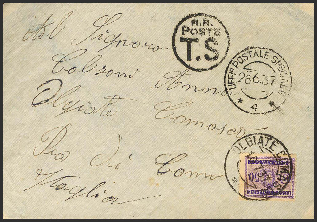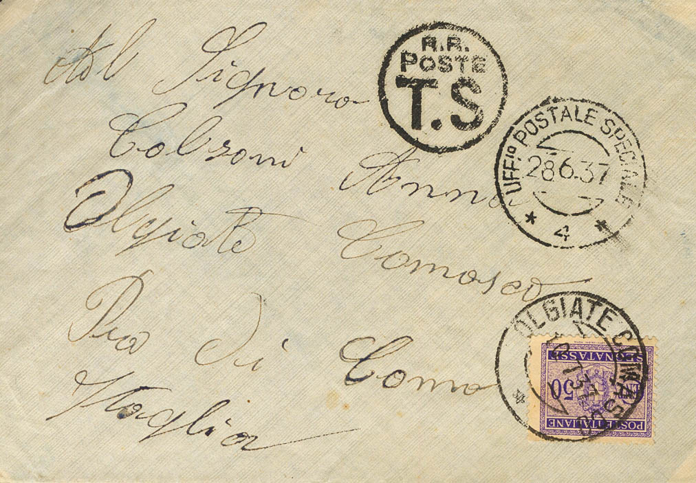 1938. Dirigida a OLGIATE COMASCO (ITALIA). Tasada a la llegada, aplicando sello de tasa de 50 cts violeta, en el frente fechador UFFº POSTALE SPECIALE / *4* y marca circular R.R. / POSTE / T.S. de tasa. MAGNIFICA Y RARA.