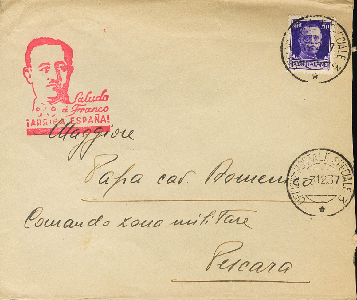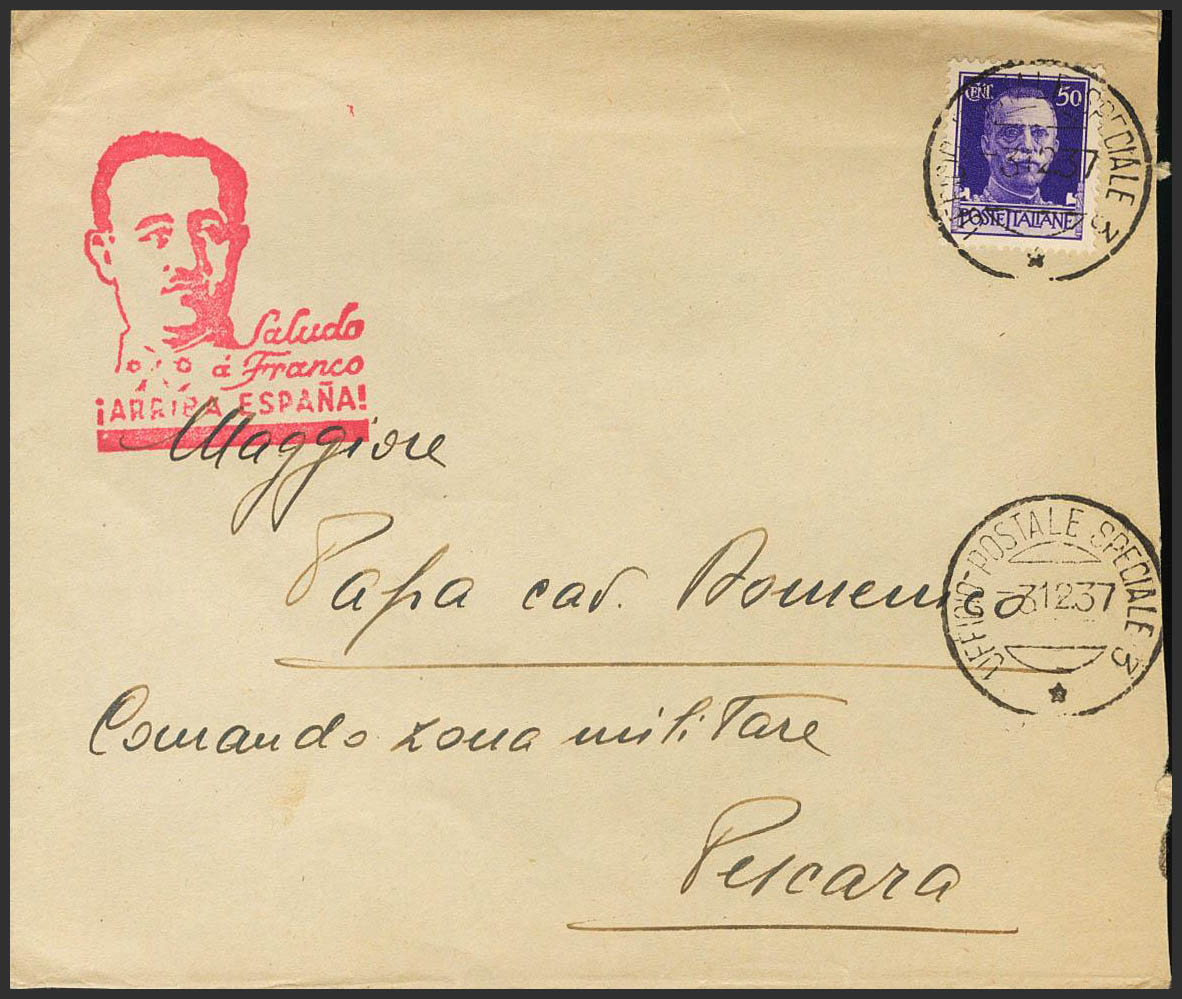 1937. 50 cts violeta de Italia. Dirigida a PESCARA (ITALIA). Matasello UFFICIO POSTALE SPECIALE 3 y al dorso membrete 2º REGGIMENTO FANTERIA / VOLONTARI DEL LITTORIO / "OSO L´INOSABILE" / COMANDO. MAGNIFICA.