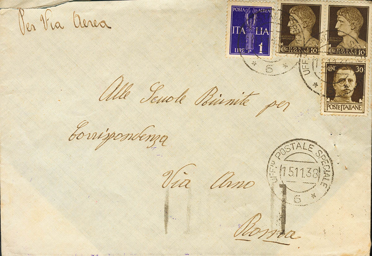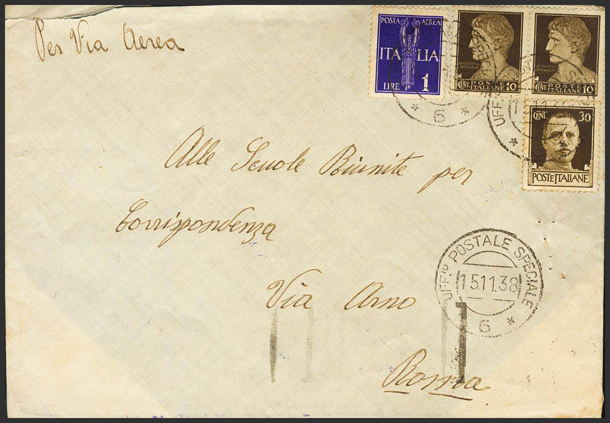 1938. 10 cts castaño, dos sellos, 30 cts castaño y 1 lira violeta, todos de Italia. Dirigida a ROMA (ITALIA). Matasello UFFIº POSTALE SPECIALE / *6*, al dorso llegada. MAGNIFICA.