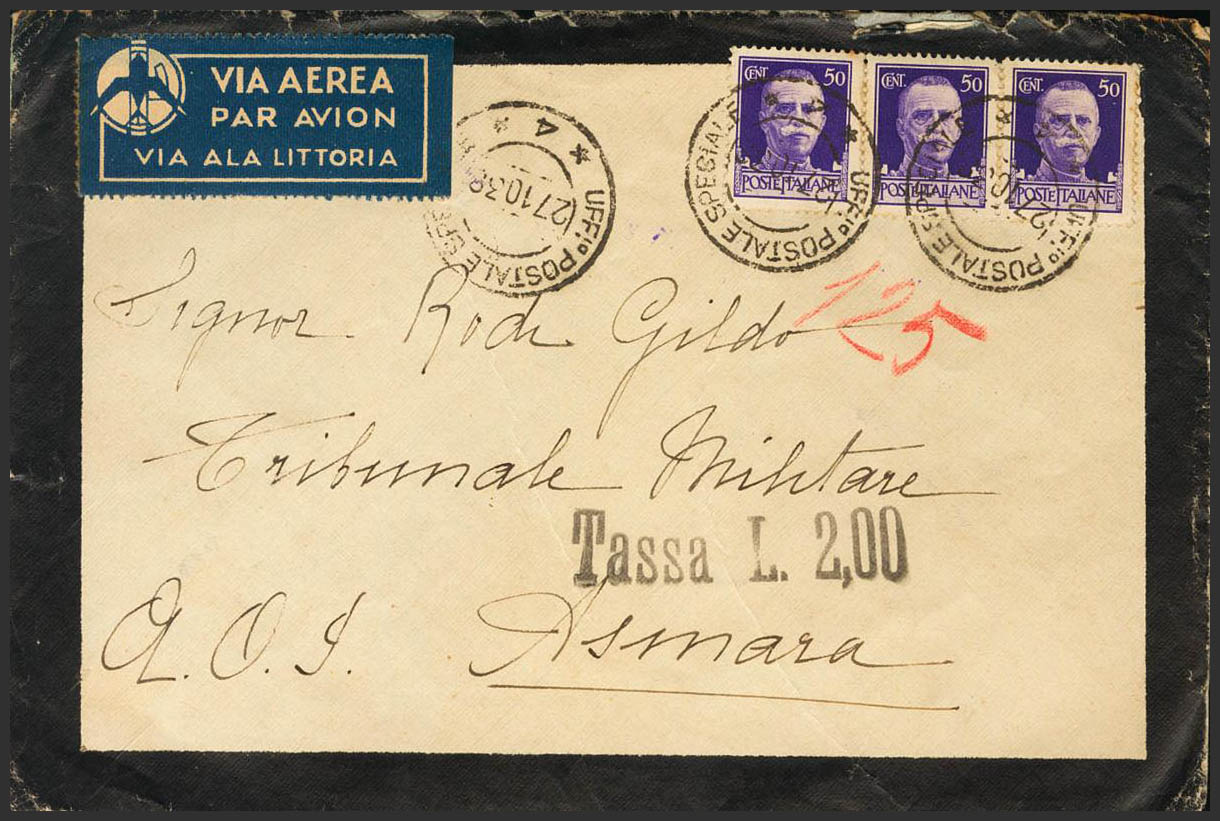 1938. 50 cts violeta, tres sellos, de Italia. ZARAGOZA a ASMARA (ERITREA). Matasello UFFIO POSTALE SPECIALE / *4* y en el frente marca TASSA L.2.00, satisfecha con sellos de tasa de Eritrea al dorso (faltan dos sellos que se han desprendido). MAGNIFICA Y RARISIMO DESTINO ESPECIALMENTE DE UN VOLUNTARIO ITALIANO.
