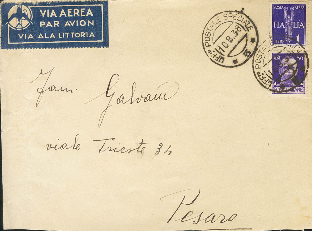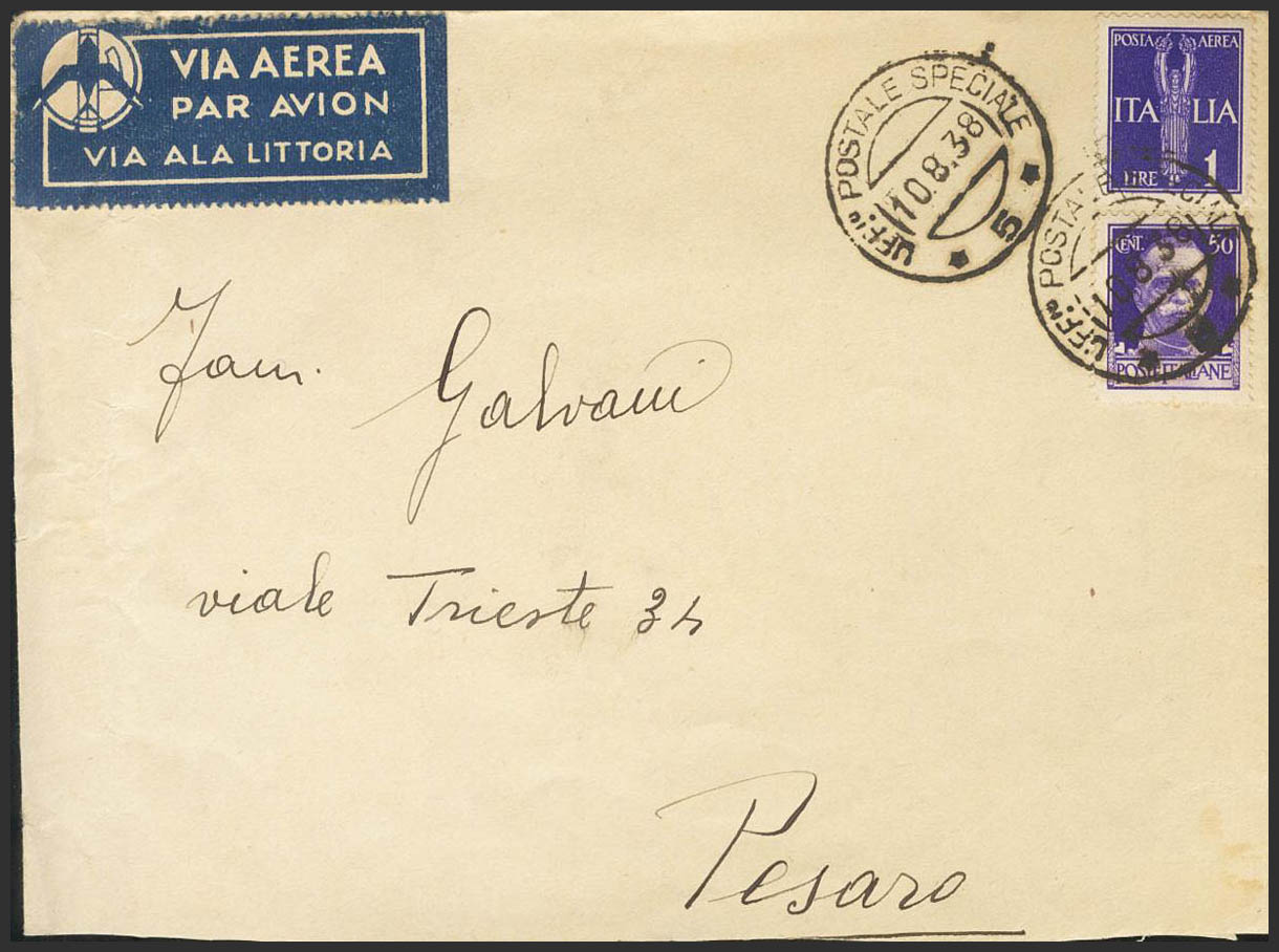 1938. 50 cts y 1 lira de Italia. Dirigida a PESARO (ITALIA). Matasello UFFIO. POSTALE SPECIALE / 5 y llegada al dorso. MAGNIFICA.