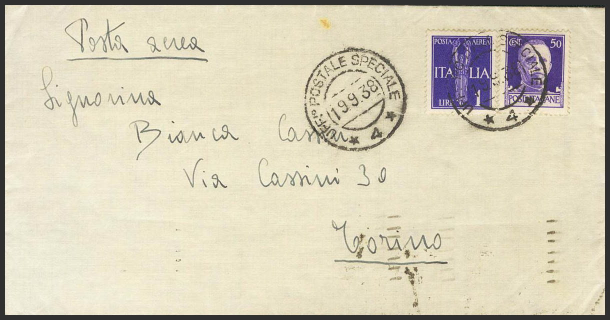1938. 50 cts y 1 l violeta de Italia. Dirigida a TURIN (ITALIA). Matasello UFFIO POSTALE SPECIALE / 4 y al dorso llegada. MAGNIFICA.