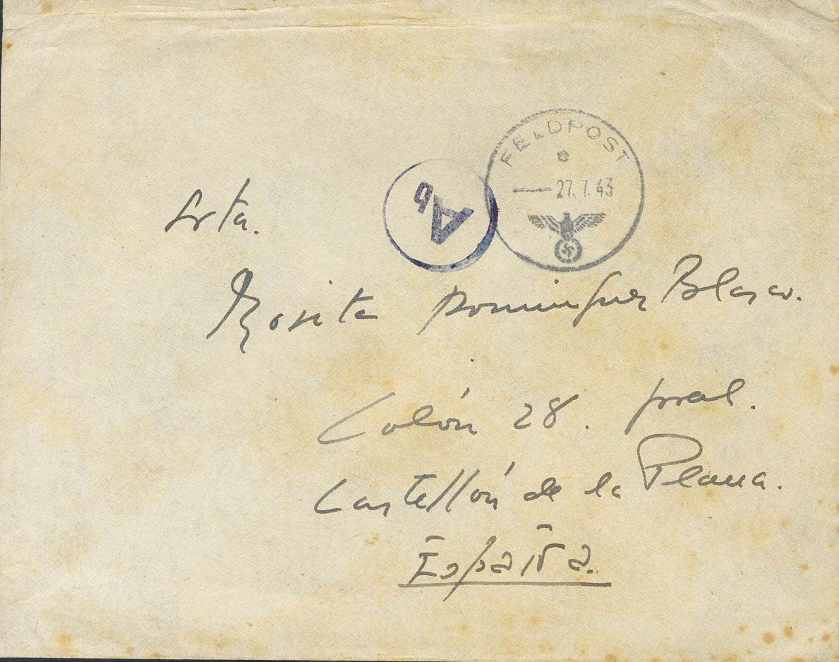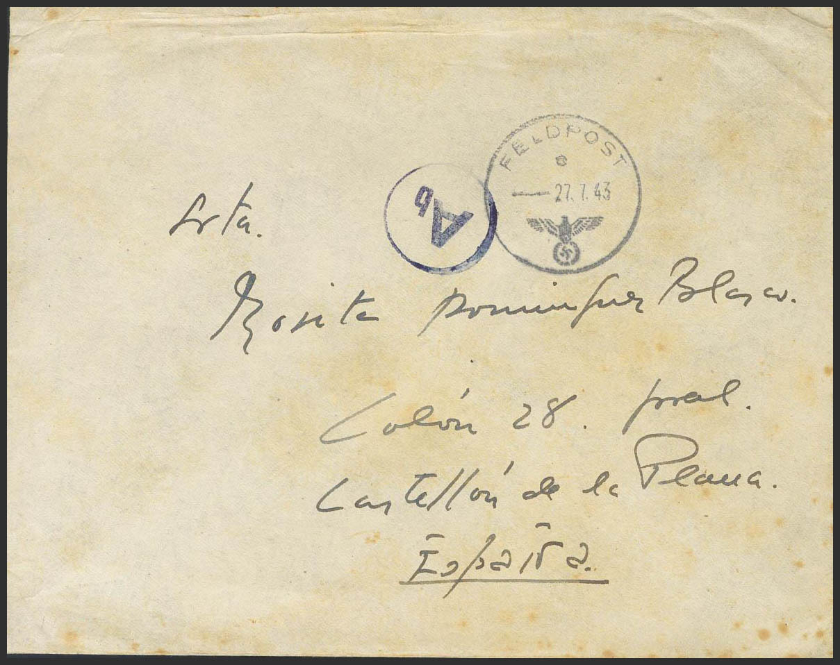 1943. Correo de Campaña FELDPOST Nº18125E (perteneciente a la 4ª CompañÃa de Ametralladoras del 269º Regimiento) dirigida a CASTELLON. Al dorso llegada. MAGNIFICA.