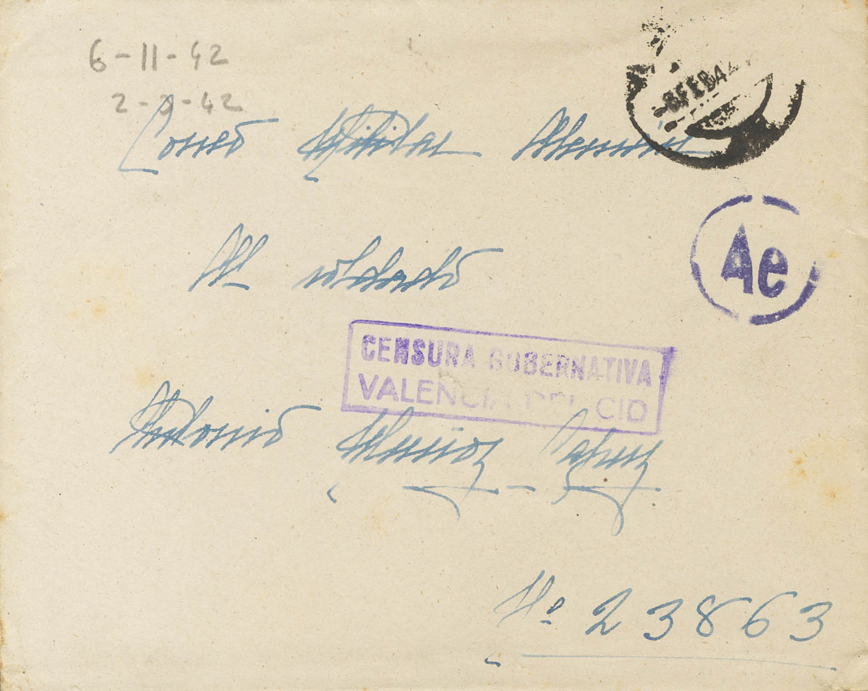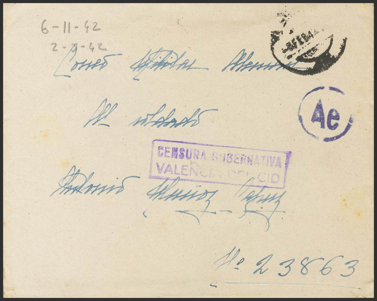 1942. VALENCIA al FELDPOST Nº23863 (Regimiento de Artillería). En el frente CENSURA GUBERNATIVA / VALENCIA DEL CID. MAGNIFICA.
